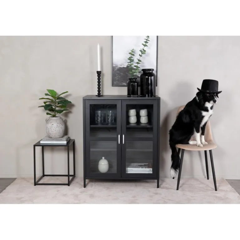 Visningsskabet er en klassisk og populær tilføjelse til interiøret! Acero relief skab i sort pulverlakeret stål med 2 glaslåger er både praktisk og iøjnefaldende. Det klare glas lader dejligt lys ind i skabet, og det skandinaviske overordnede design med lige, stilfulde linjer giver møblet et moderne look. Skabet er understøttet af høje, smalle ben, hvilket giver et luftigt udseende og letter også rengøringen med støvsugeren. Fyld skabet med alt fra trendy dekorationer til bøger og porcelæn! Plejeråd: Aluminium og krom er to materialer, der er modstandsdygtige over for snavs og væsker. Dog skal du være opmærksom på, at vand kan forårsage pletter og rust. Sørg derfor for at tørre overfladen af med en blød, fugtig klud og sæbevand. Hvis pletterne eller rusten sidder for hårdt, anbefales en blød klud fugtet i ren alkohol.
