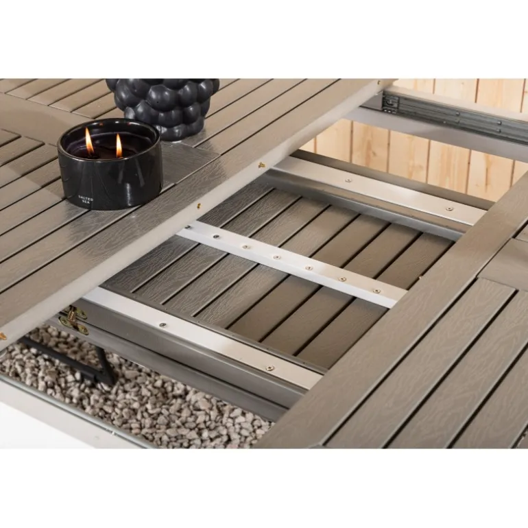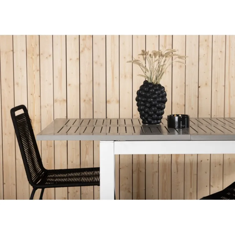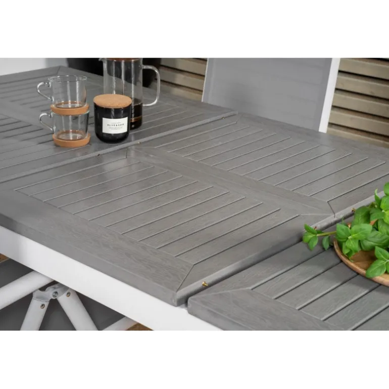 Albany er et udtrækkeligt spisebord med alt det rigtige – stilfuldt, praktisk og tidløst! Bordpladen er i grå Aintwood og kroppen i hvid aluminium; to holdbare materialer, der giver dig et bord, som holder over tid. Den rette nordiske form giver et robust og rent indtryk. Møbler terrassen og skab et charmerende centrum at samle dine kære omkring! Plejeanvisning: Materialet er designet til udendørs brug, da det er vejrbestandigt og modstår både fugt og skimmel. Aintwood er derfor et optimalt materiale til udendørsmøbler. Undgå skader på bordet ved at bruge underlag og ikke placere varme genstande direkte på overfladen.