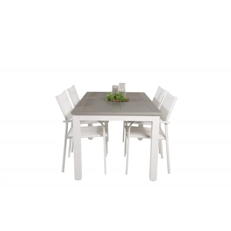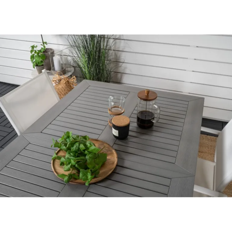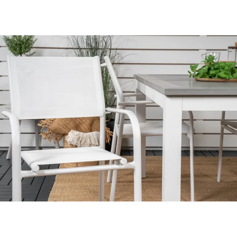 Vores udtrækkelige spisebord Albany i et slankt design, sammen med spisestolene Santorini – den perfekte kombination for dem, der ønsker et trendy Loungesæt – Havemøbelsæt på terrassen. Stolene har en høj siddekomfort, som indbyder til lange og dejlige stunder til socialt samvær!