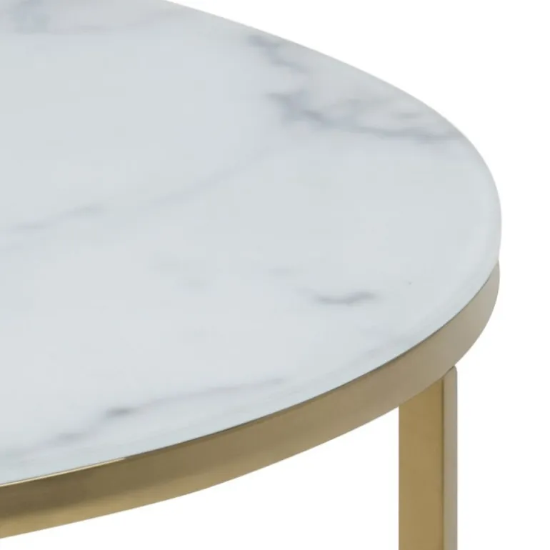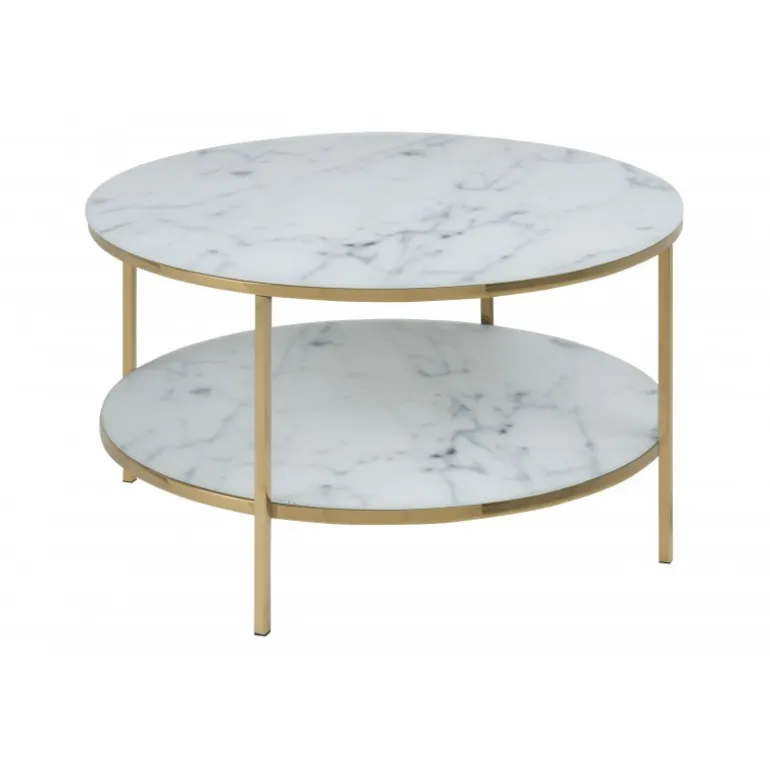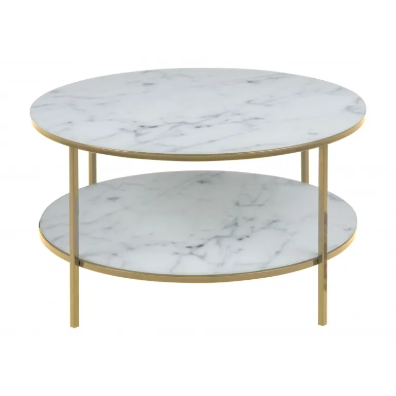 Alisma sofabord bordplade glas krystalklar hvid marmor print, 6 mm, hylde 1 stk, stel metal gylden krom Ø:80 H:45 cm