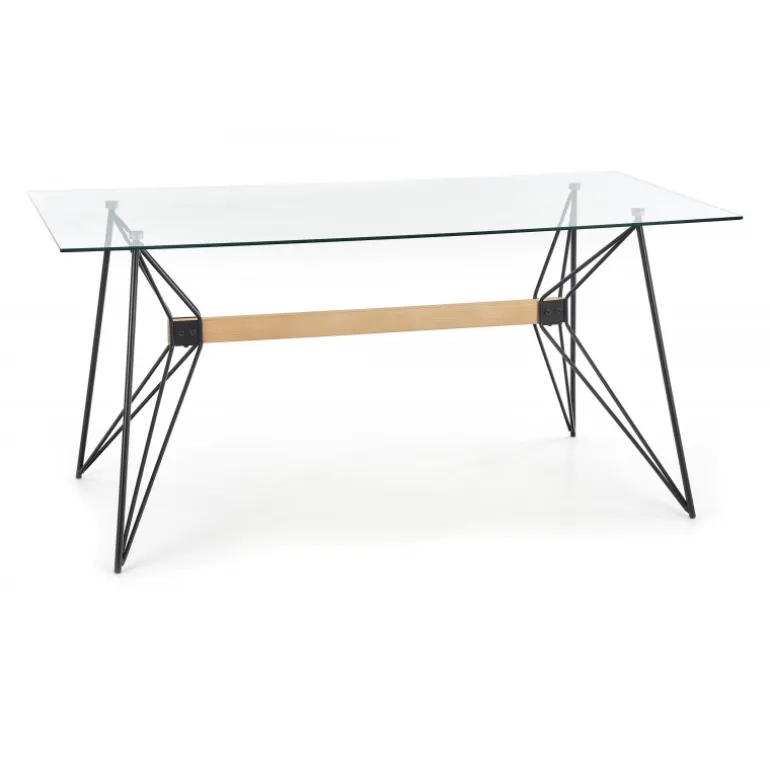 - Materiale: Top i transparent glas, ben i solid bøgetræ og pulverlakeret stål.