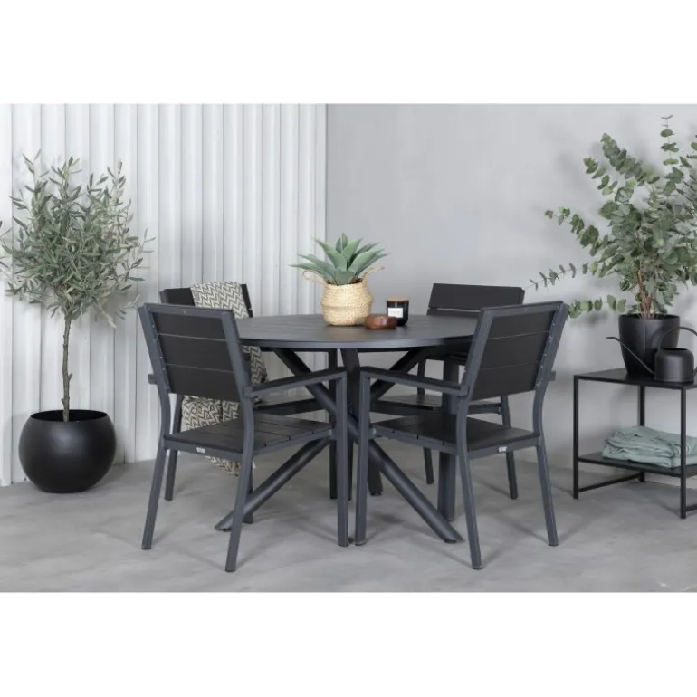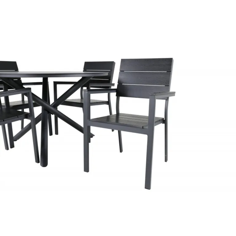 Delikate matchende Loungesæt – Havemøbelsætr til alle sommermåltider – passer lige så godt i udendørsområdet som på altanen! Levels er en praktisk stol i sort aluminium med sort sæde og ryg i Smaster Aintwood. Stolen er stabelbar, hvilket giver nem opbevaring. Her sammen med vores runde spisebord Alma i sort aluminium. Skab den perfekte sociale atmosfære på terrassen!
