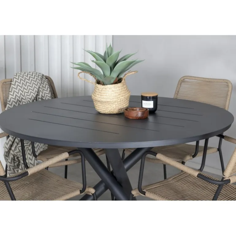 En jordnær og tidløs Loungesæt – Havemøbelsæt til terrassen! Vores populære Lindos spisebordsstole i lækker lattefarvet reb med stilfulde, smalle ben og integrerede armlæn i sort stål er en ægte designikon. Her sammen med det smagfulde Alma spisebord med dekorative krydsben i sort aluminium. Et rundt Loungesæt – Havemøbelsæt er perfekt til dig, der ønsker at skabe en hyggelig og familiær atmosfære i dit udendørsrum eller på altanen – så inviter familie og venner og nyd dejlige måltider sammen!