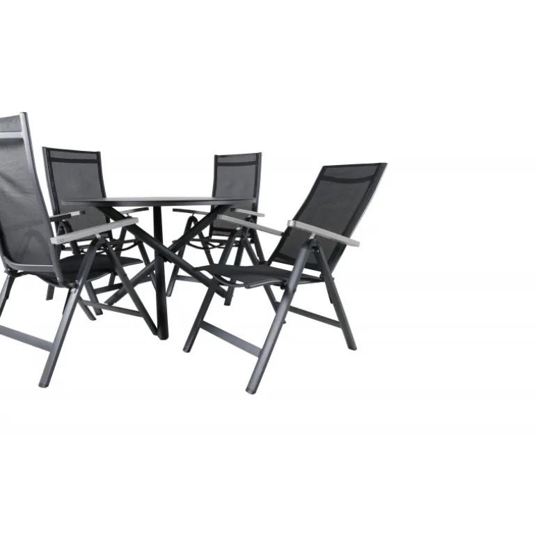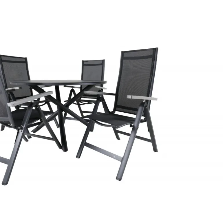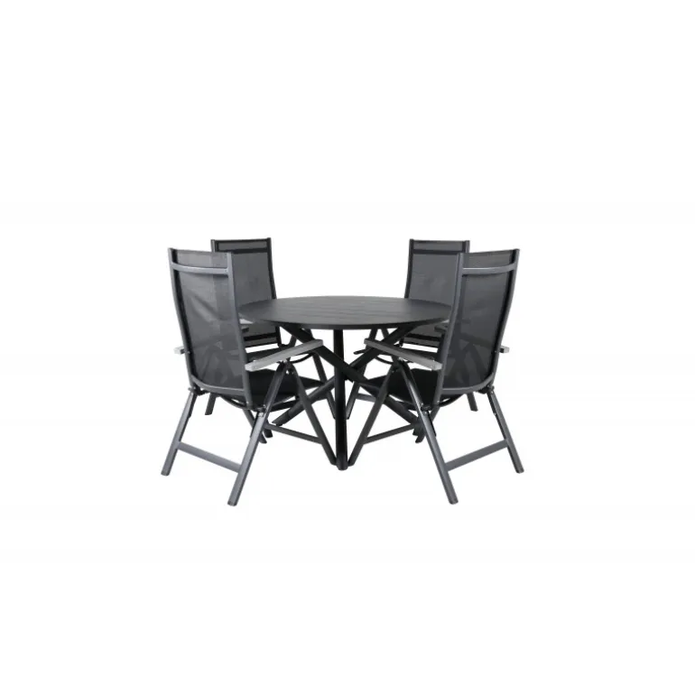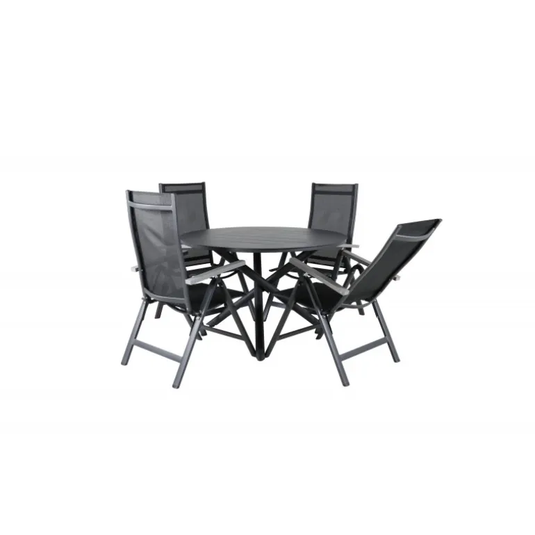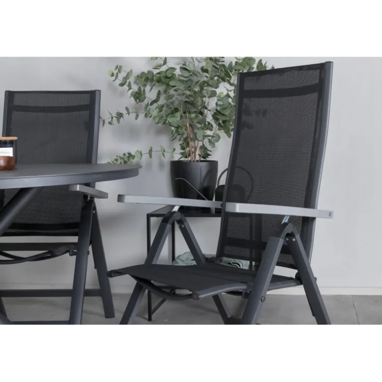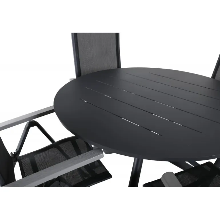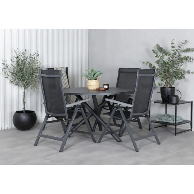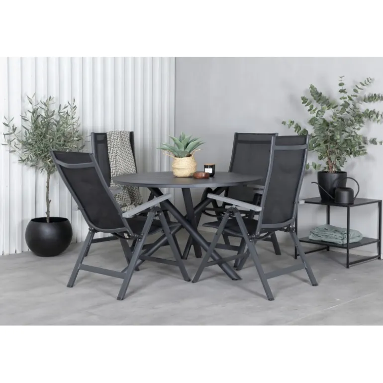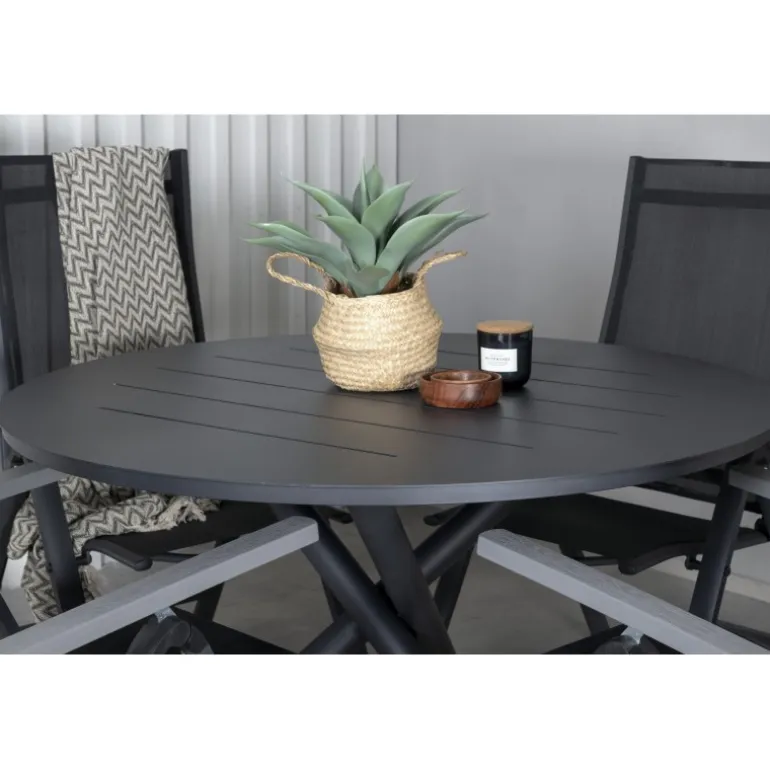 Stilet, holdbart og smart! Her tilbydes du det bedste fra alle verdener, når du kombinerer vores runde spisebord Alam i sort farve med komfortable, justerbare stole fra Albany-serien. Spisebordet har et klassisk og tidløst design, og i stolene sidder du og dine gæster komfortabelt i flere timer. Skab et moderne blikfang på terrassen denne sommer!