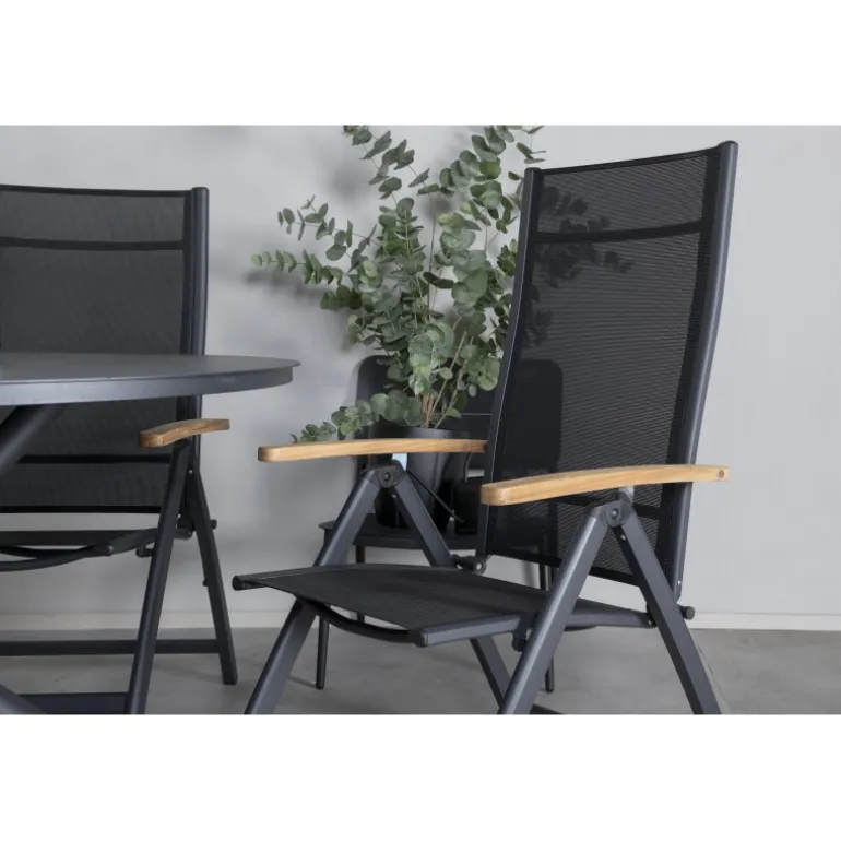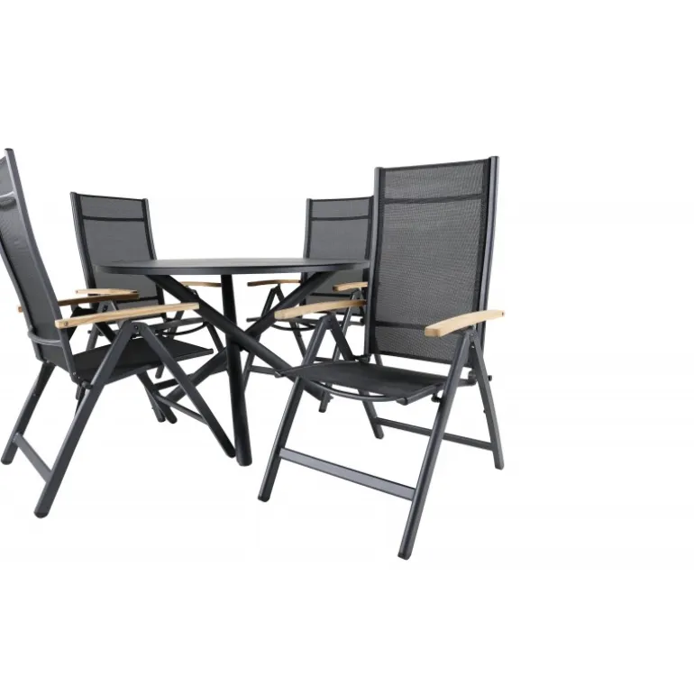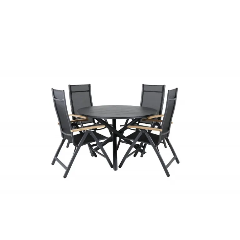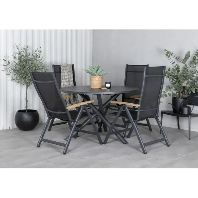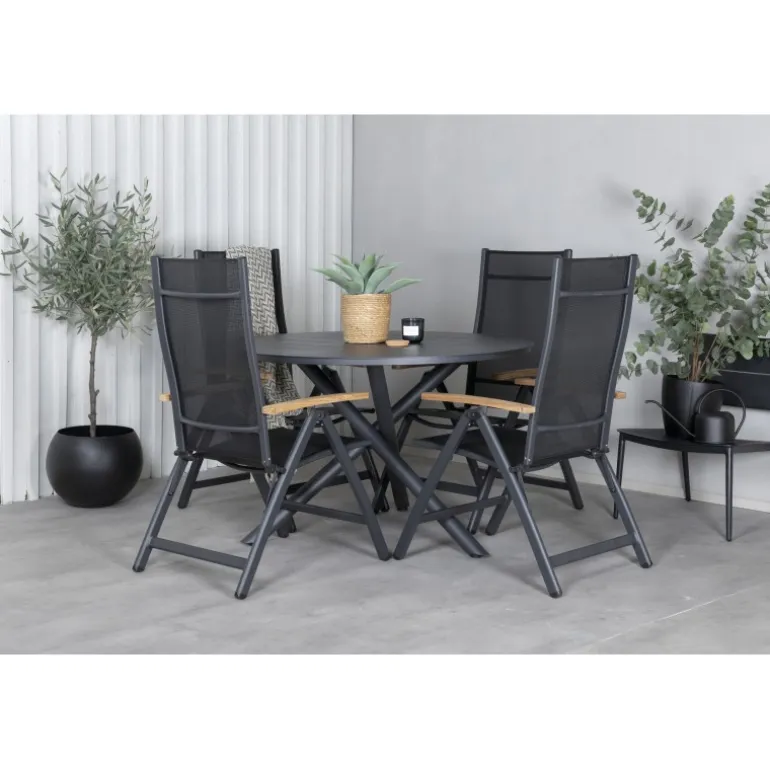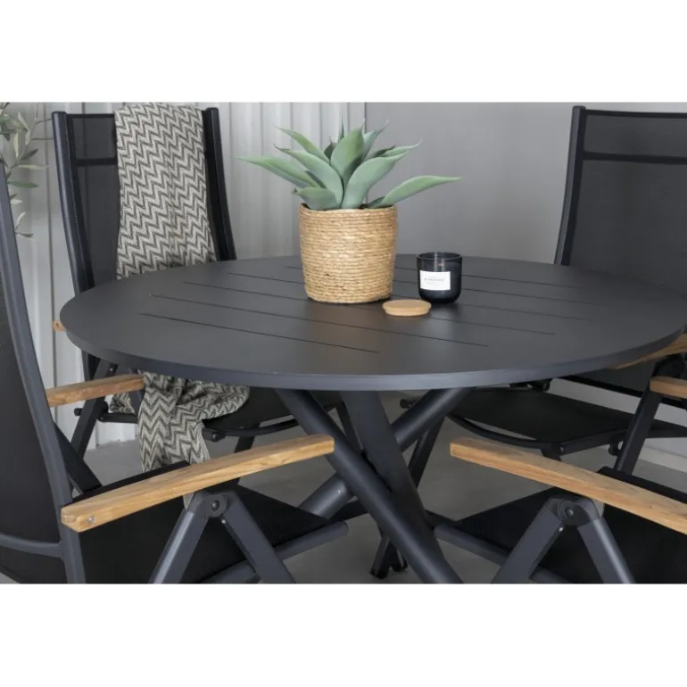 Stilfuldt, moderne og praktisk – et Loungesæt – Havemøbelsæt, der imponerer! Vores runde spisebord Alma i sort aluminium sikrer, at ingen ender på kanten. Her sammen med vores justerbare sorte spisebordsstole fra Panama-serien. Stolene er lavet af tekstil med lækre detaljer i teak, der skaber et luksuriøst blikfang. Inviter familie og venner og nyd dejlige måltider sammen!