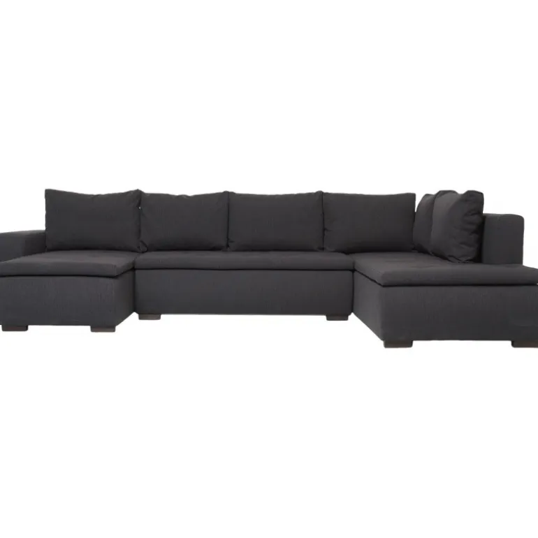 Amalfi U-sovesofa med venstrevendt chaiselong og open-end modul. Sofaen kan slåes ud i midten og omdannes til en bekvemmelig soveplads for 2 personer. Under midterdelen på sofaen er et magasin, som nemt kan indeholde dyner og puder når sofaen bruges i dagligdagen. Amalfi sofaen er designet med en blød topdel med punktsyninger som giver sofaen en medium/blød ligge- og siddekomfort, rundet armlæn og løse rygpuder. Sovesofaen er betrukket med et slidstærkt antracit farvet møbeltekstil.