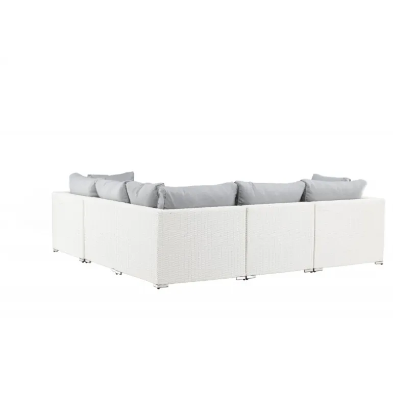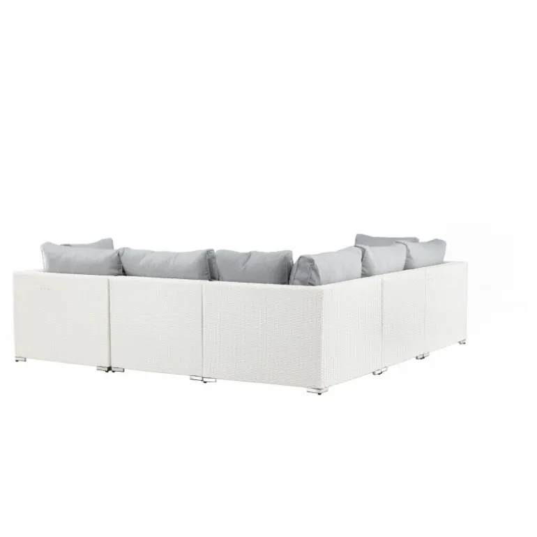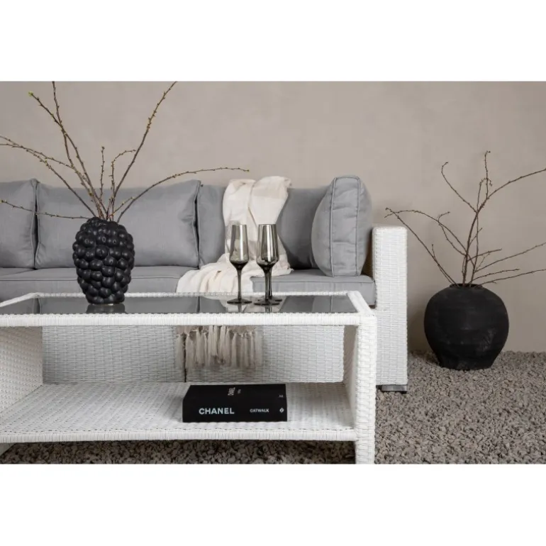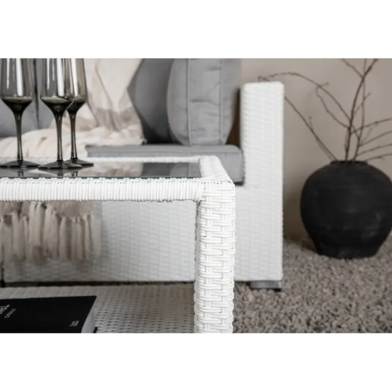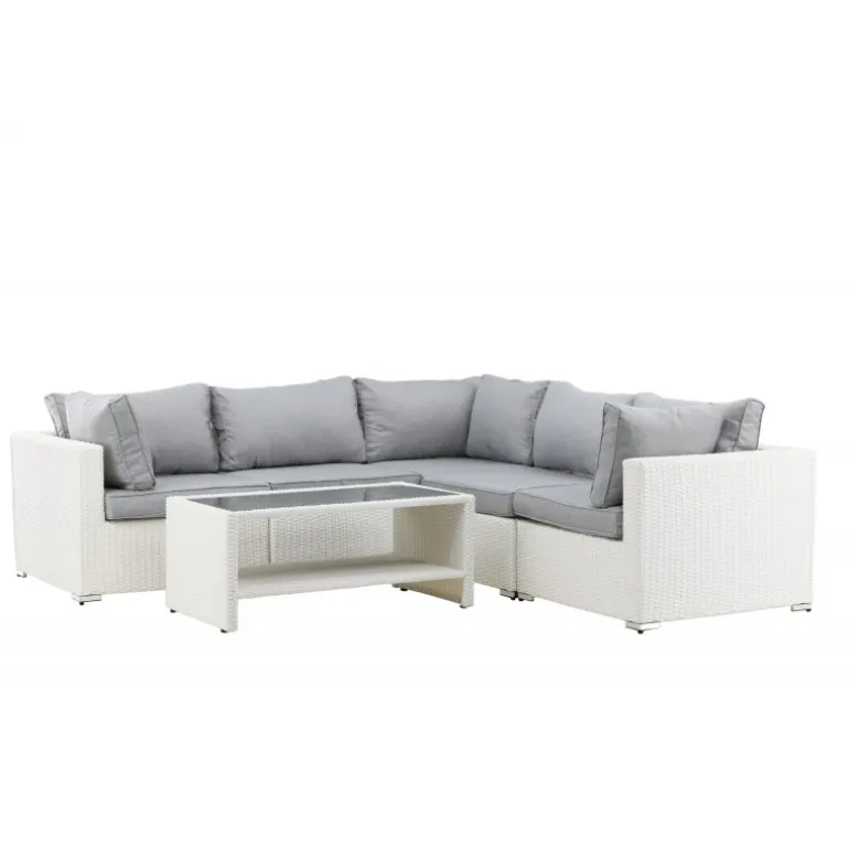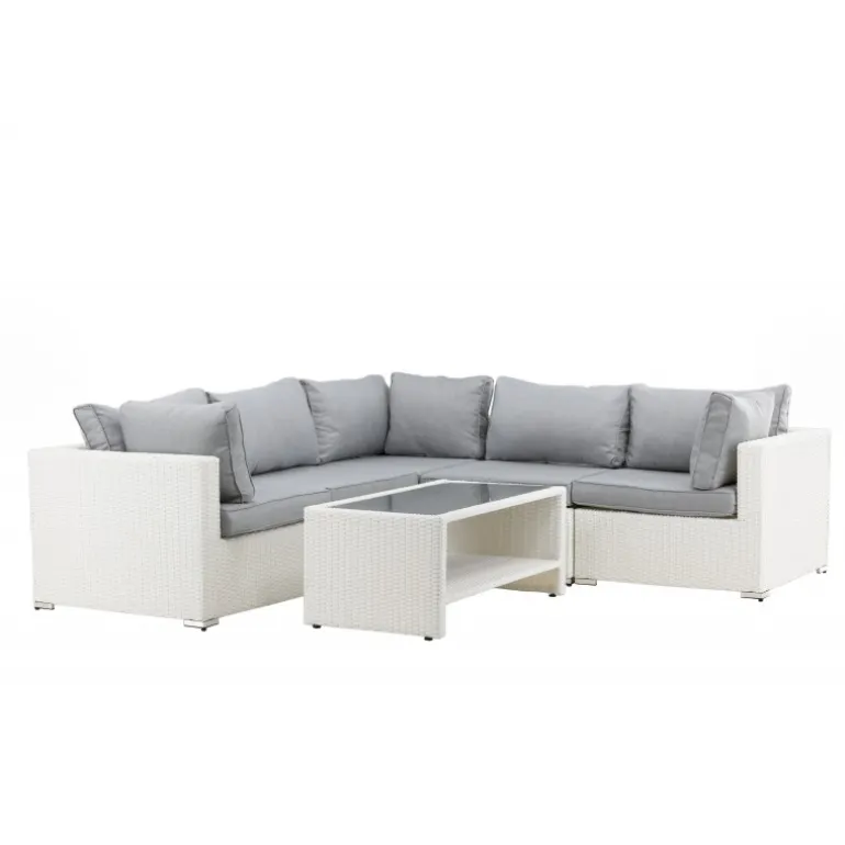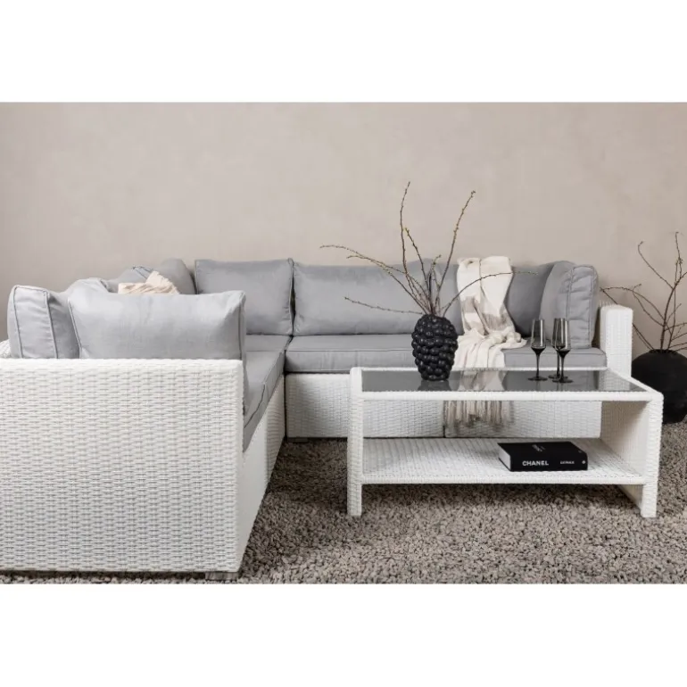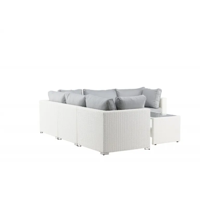 Amazon Hjørnesofa Sæt imponerer med sit moderne design, der fokuserer på god komfort til din terrasse eller patio. Sofaen består af en modulær hjørnesofa med fire sæder og en hjørnedel, som er let at samle, så den passer til dine behov. Bløde mørkegrå puder er inkluderet samt et matchende, lavt sofabord med en glasbordplade. Lavet af en metalramme og hvid kunstig rattan – to holdbare materialer, der er fremragende til udendørs brug! Gør dig klar til en fremragende sommeraften. Plejeråd: Konstriten er et plastmateriale, der er perfekt til vores skandinaviske klima. Materialet er UV-resistent og kan modstå vejr og vind. At det er UV-resistent betyder, at møblerne ikke falmer, men vi anbefaler altid at opbevare møblerne under møbelbeskyttelse eller ellers tørt og køligt for at forlænge levetiden.