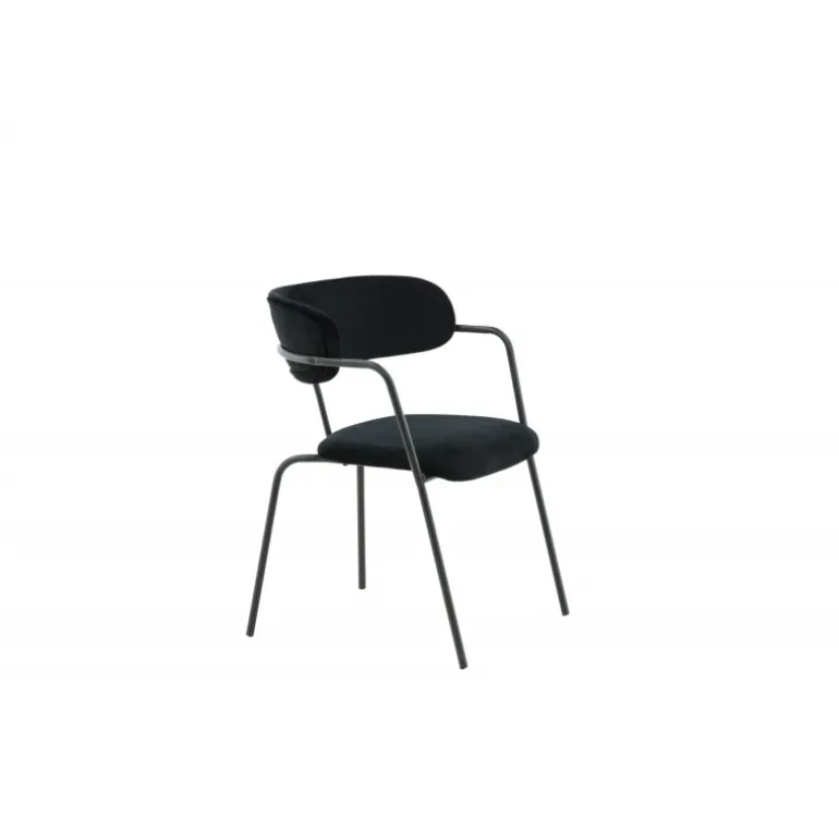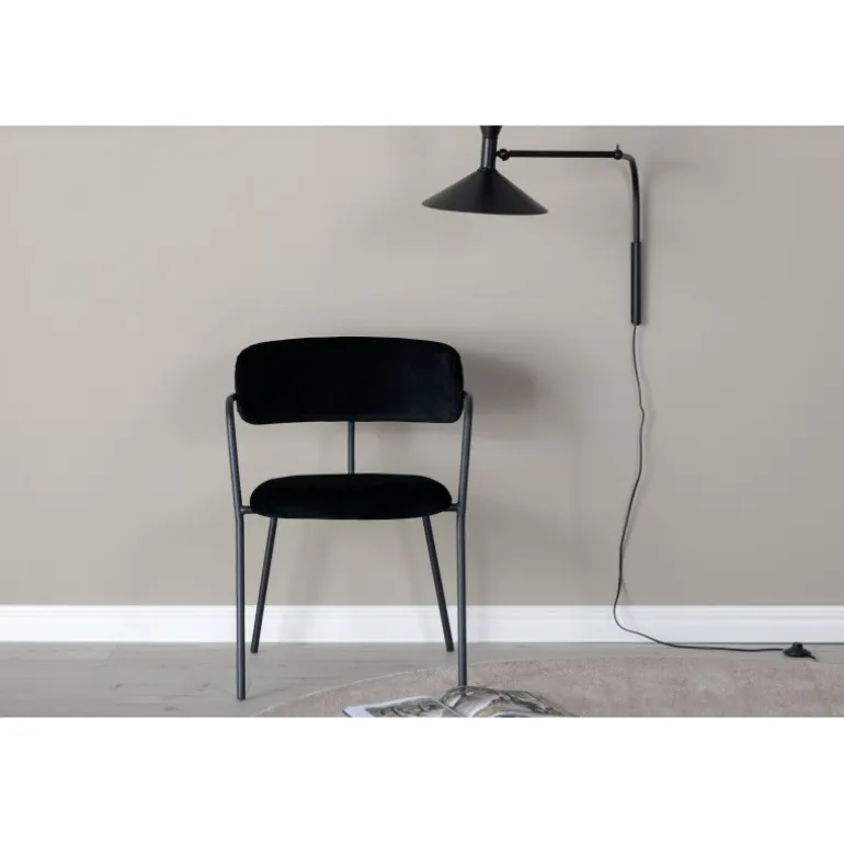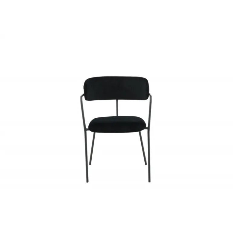 Stilfuld, praktisk og tidløs – en spisestol med alt det rigtige! Arrow har et minimalistisk design med ramme, ben og integrerede armlæn i sort pulverlakeret metal. Ryggen er let rundet i samme materiale som sædet, betrukket med stoppet sort velourstof. Lige så komfortabel som stilfuld, disse stole vil helt sikkert blive en succes i hjemmets hjerte! Lettere samling er påkrævet. Plejeråd: Brug tekstilspray til at imprægnere stoffet, inden du begynder at bruge det, det vil også gøre snavs og pletter lettere at fjerne i fremtiden. Fjern pletter med det samme, gnid ikke, men prøv at opsuge forsigtigt med en klud.