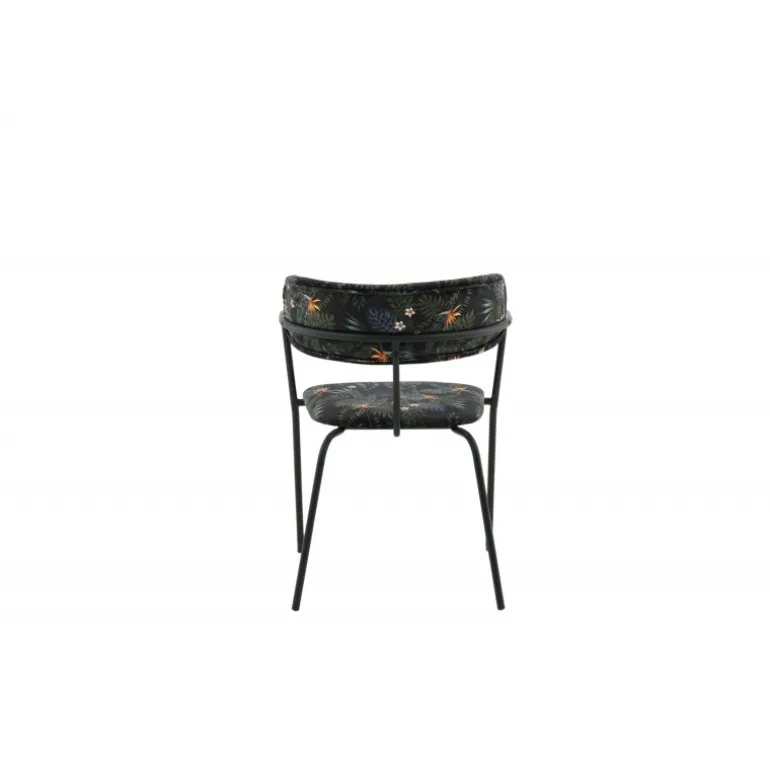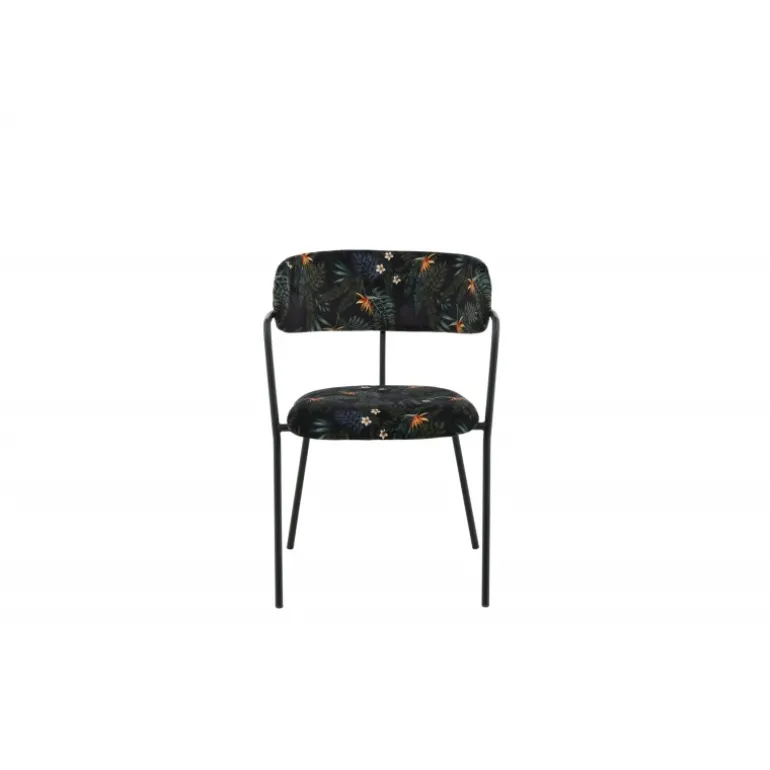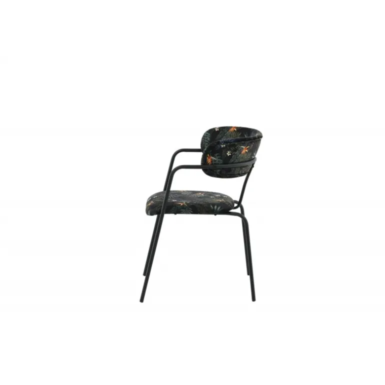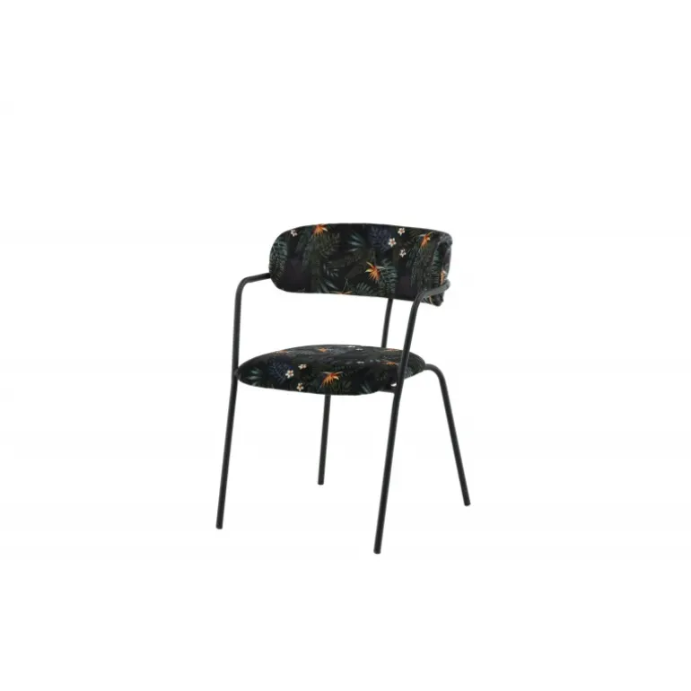 Skab et iøjnefaldende fokuspunkt med Arrow spisestol fra Arrow-serien! Denne spisestol har ben og integrerede armlæn i sort pulverlakeret metal og et stilfuldt design med en buet ryg. Ryg og sæde er polstret med sort, blomster-mønstret polyesterstof, der skaber et personligt præg i indretningen. Nogle samlinger kræves. Plejeinstruktioner: Fjern straks pletter, gnid ikke, men forsøg forsigtigt at opsuge med en klud. Hvis pletterne ikke går væk, prøv en pletfjerner, som du har testet på en mindre synlig del af stoffet først. Vi anbefaler, at større møbler renses mindst tre gange om året.