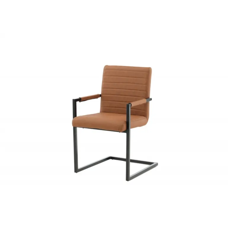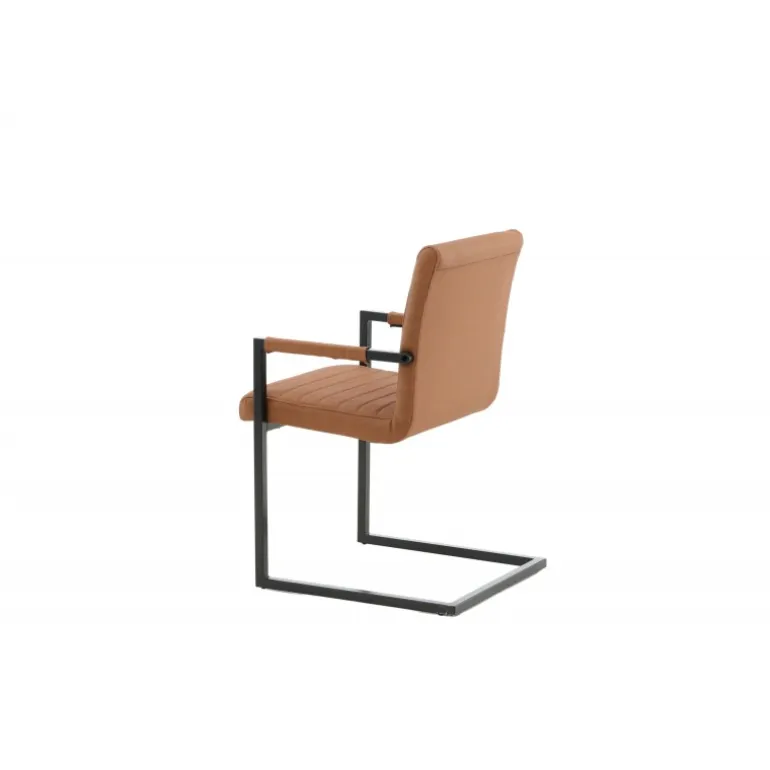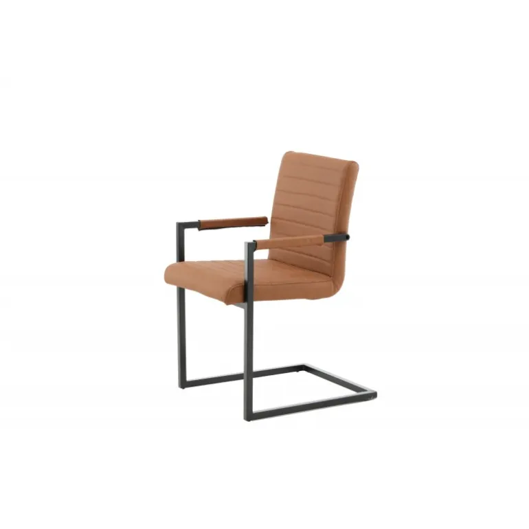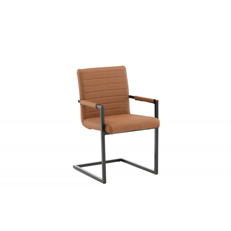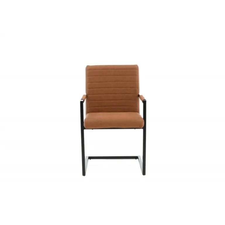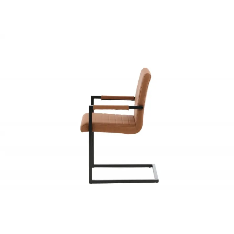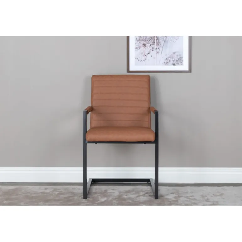 Art Spisebordsstolen tilbyder dig en lænestol i et industrielt fuldt polstret design, med et rustikt understel og integrerede armlæn i sort pulverlakeret metal. Den brede ryg og sæde giver ekstra komfort med brun kunstlæder og dekorative syninger på indersiden af ryggen og sædet i et flot mønster. Let samling er påkrævet. Plejeråd: Ved kraftige pletter kan en fugtig bomuldsklud og et rengøringsmiddel beregnet til bycast & PU anvendes; prøv først på et ikke-synligt område, da nogle midler kan have forskellige sammensætninger.