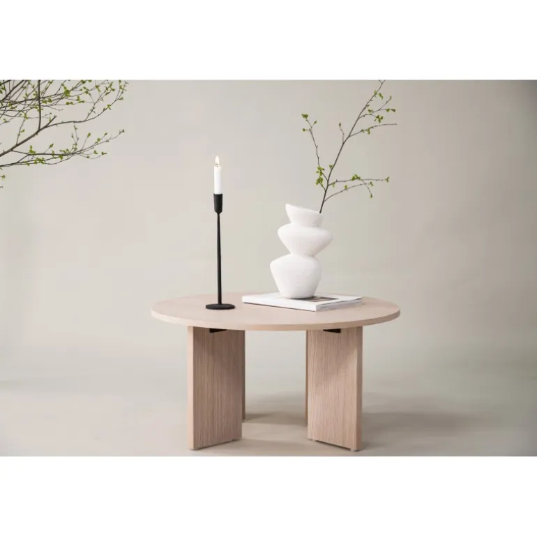 Askeron – et sofabord, der er helt i tråd med de nyeste trends! Bordpladen er rund i hvidbejdset træ, og understellet er dekorativt med fire støttende planker i samme materiale. Det gennemtænkte helhedsdesign imponerer og skaber en behagelig blikfang foran sofagruppen. Dekorér med en flot vase og nogle lysestager for en hjemlig følelse og følg vores vedligeholdelsesråd for de bedste tips til, hvordan bordet holder sig over tid!