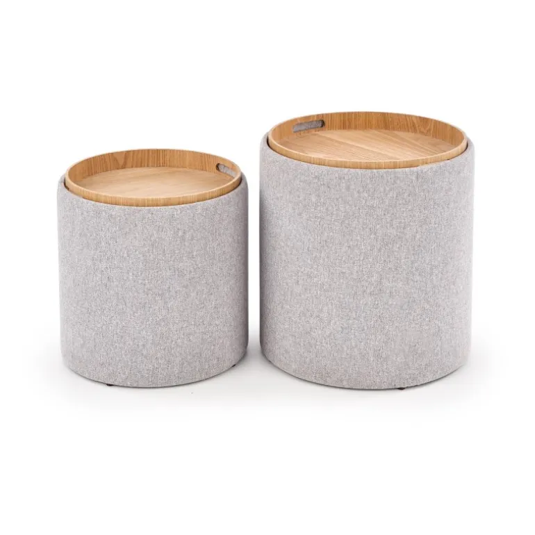 AVIKO sæt af to, farve: lysegrå, er det perfekte valg til din fritidsindretning. Disse moderne og funktionelle møbler har opbevaringsfunktion, hvilket gør dem ideelle til små rum. Hver enhed har en stilfuld kombination af klæde og MDF med naturlig finér, hvilket giver et elegant udseende. Med dimensioner på fi38/45 cm og fi35/39 cm passer de nemt ind i ethvert miljø og giver plads til at opbevare dine ejendele på en diskret måde.