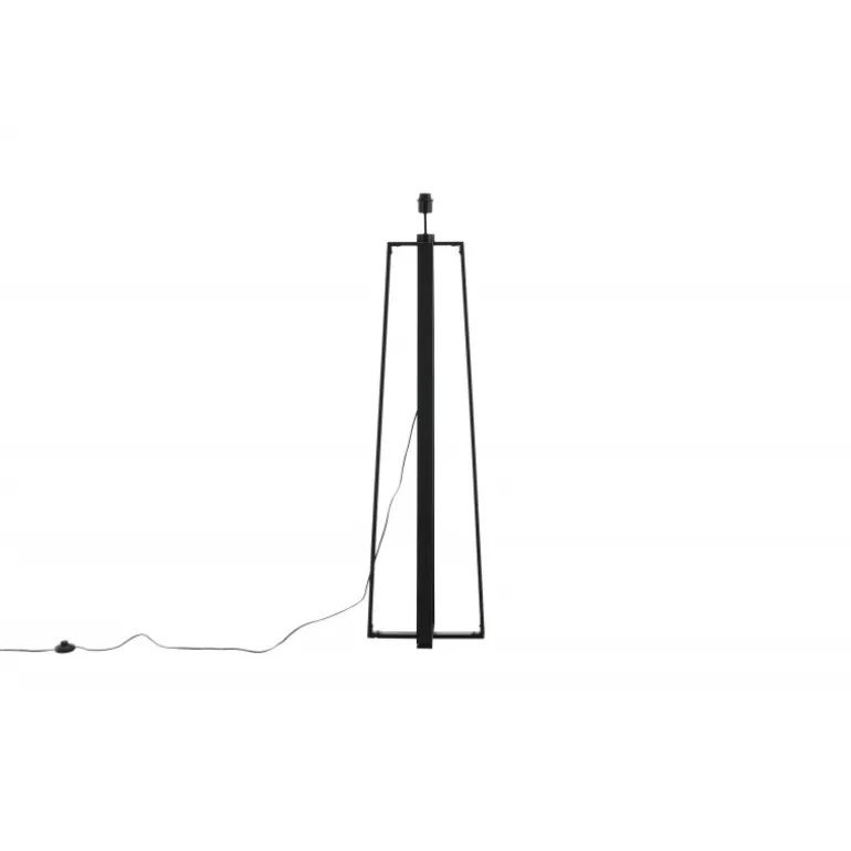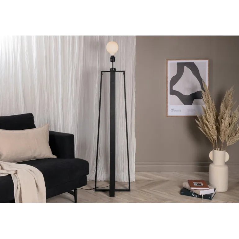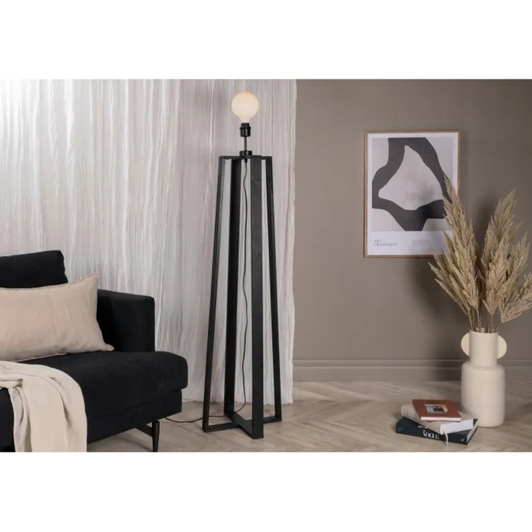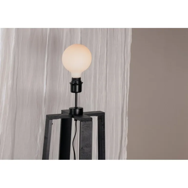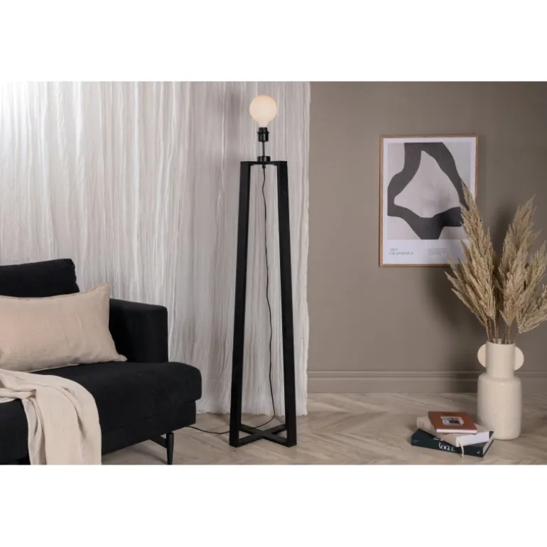 Tidløs gulvlampe i sort træ med krydsede ben. Ideel til soveværelset eller stuen. En lampe, der tiltrækker opmærksomhed med sit moderne design! Avspark Belysning er lavet af glas, PVC og stål, hvilket sikrer et holdbart og stilfuldt look. Perfekt til at tilføje et strejf af elegance til ethvert rum.
