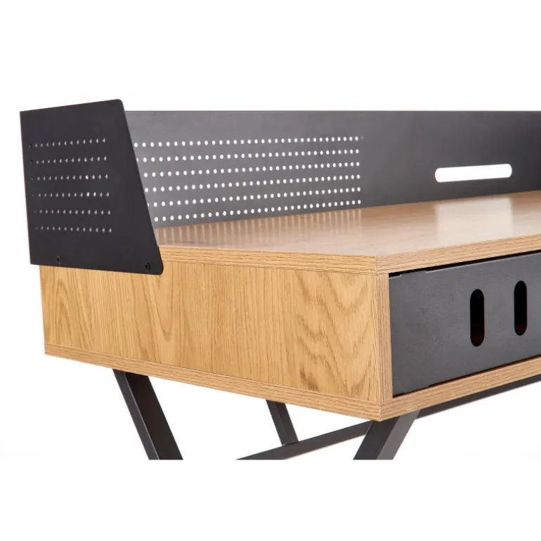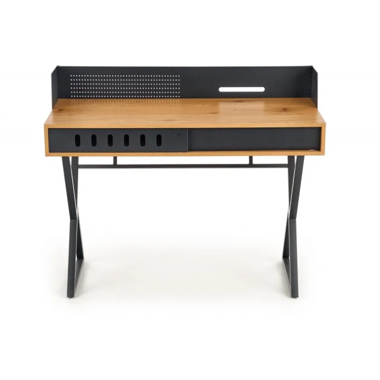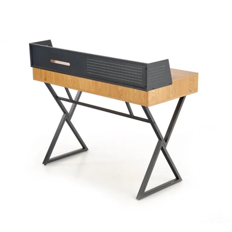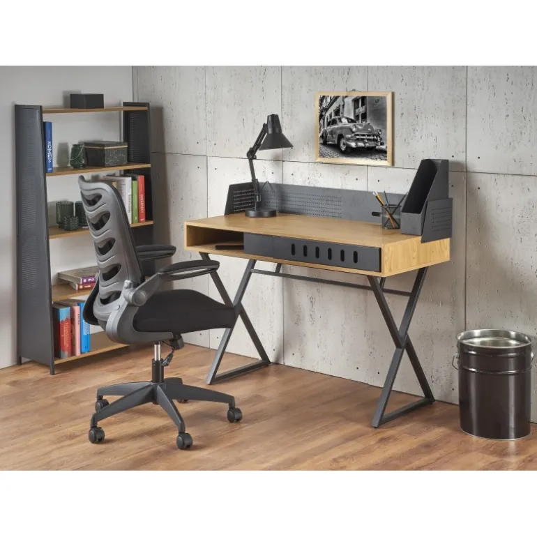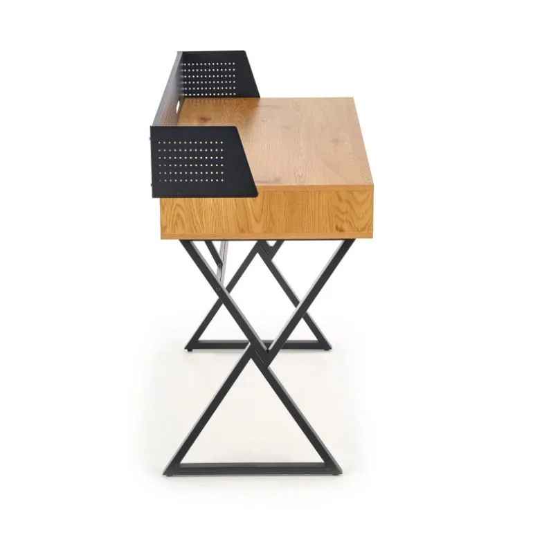 B43 Skrivebord er den ideelle løsning til dit kontor eller arbejdsområde. Med dimensionerne 110/51/90 cm, tilbyder dette skrivebord rigelig plads til dine arbejdsopgaver. Lavet af lamineret MDF og pulverlakeret stål, er det både robust og stilfuldt. Den gyldne eg og Sorte farvekombination giver et moderne og elegant look, der passer perfekt til enhver indretning.