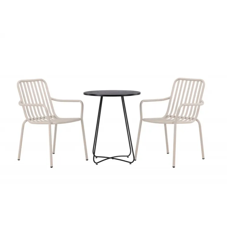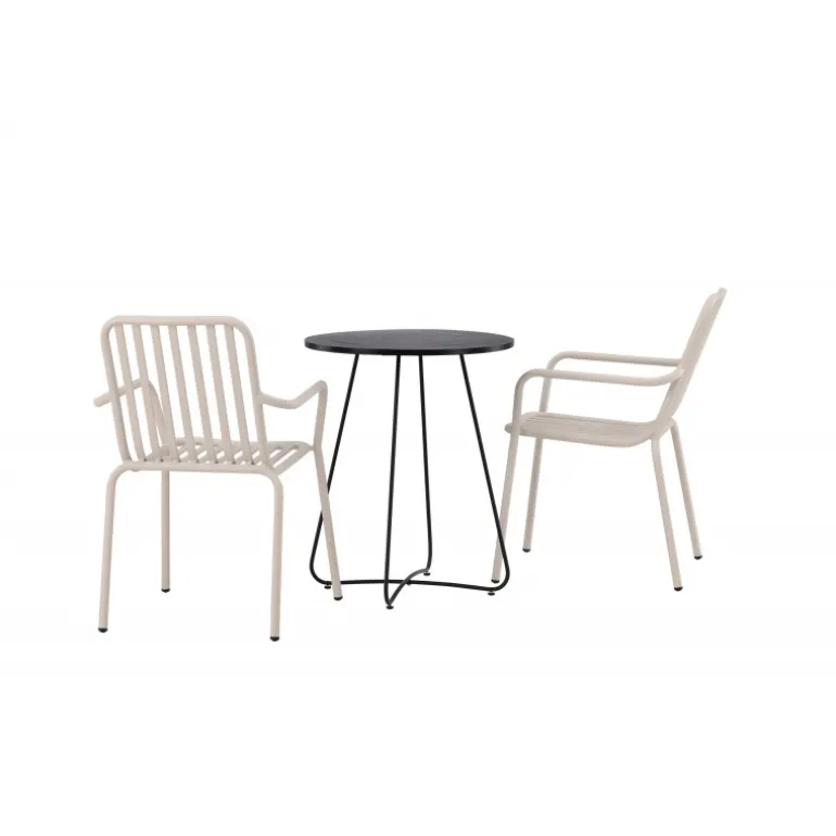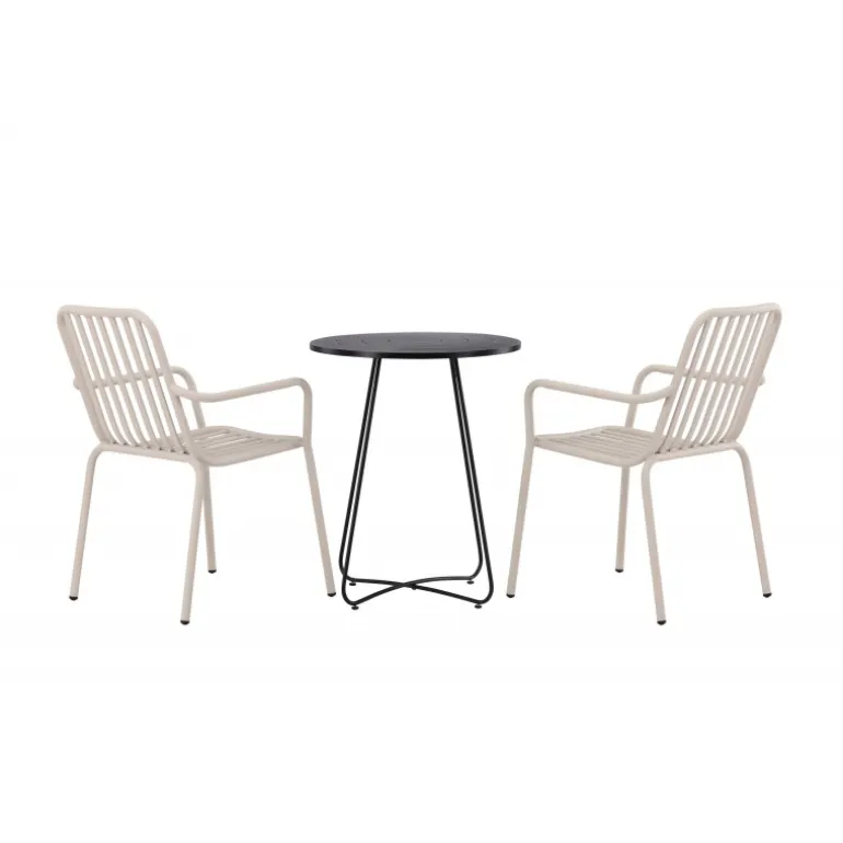 Minimalistisk og indbydende! Det charmerende cafébord fra Bacong-serien har en rund top og slanke ben i sort stål. Her i perfekt kombination med 2 spisestole fra Beijing-serien. Det ribbede design i aluminium og den flatterende beige farve gør stolen både moderne og tidløs. Her får du den perfekte cafégruppe til den lille balkon eller terrasse. Nyd din frokost udenfor denne sommer! Bordets diameter: 60 cm.