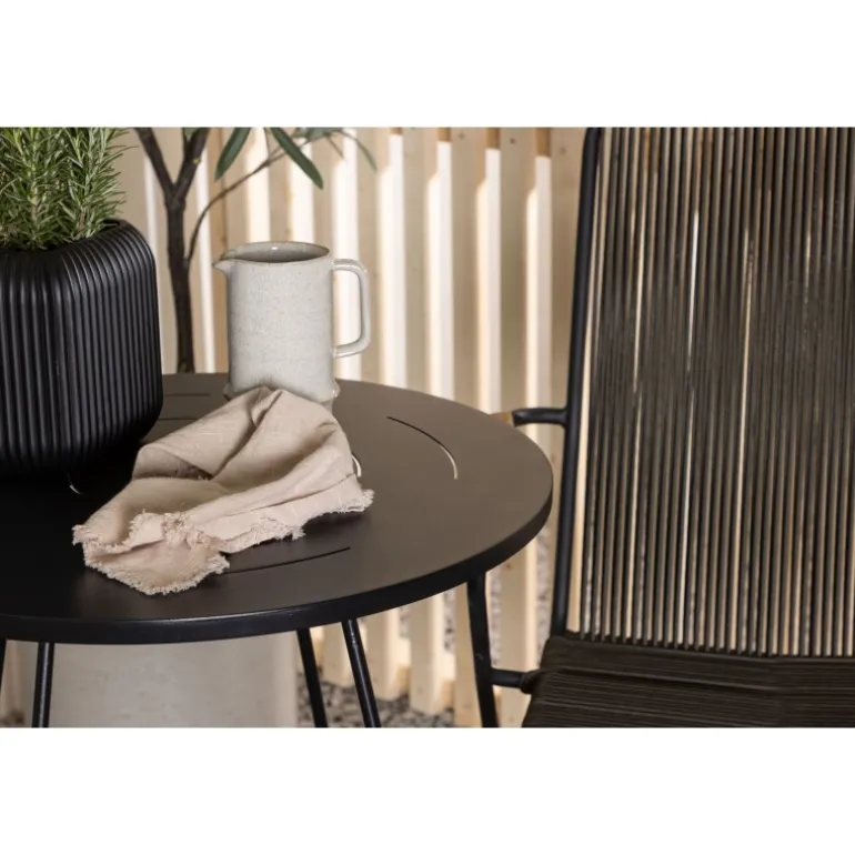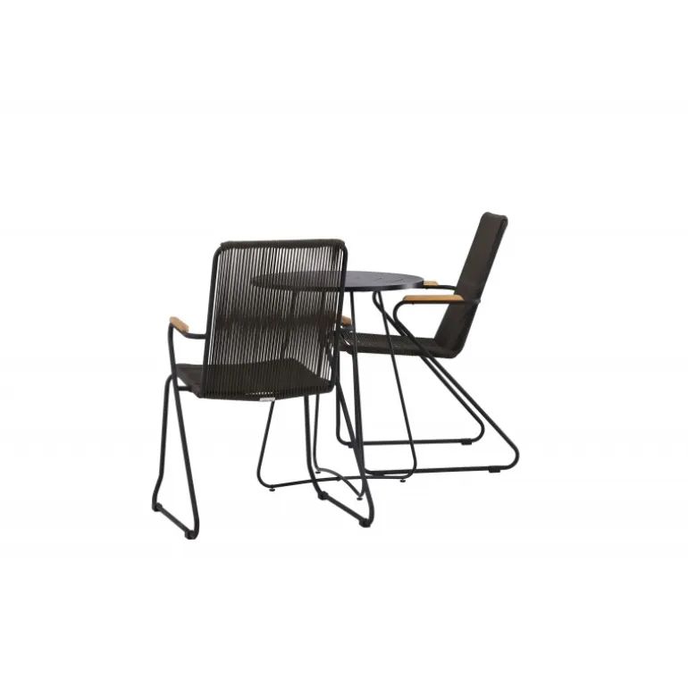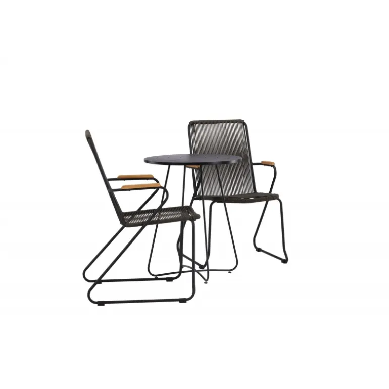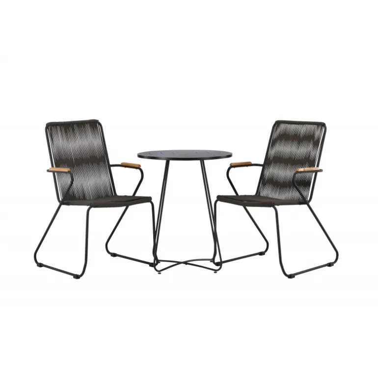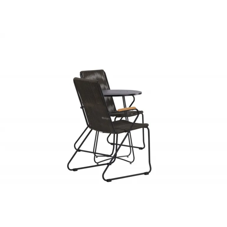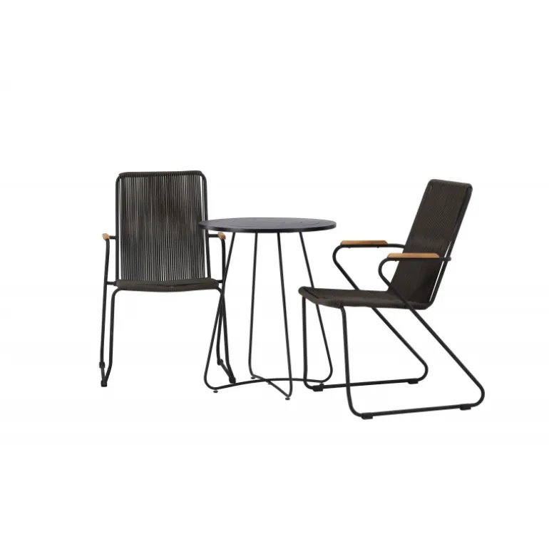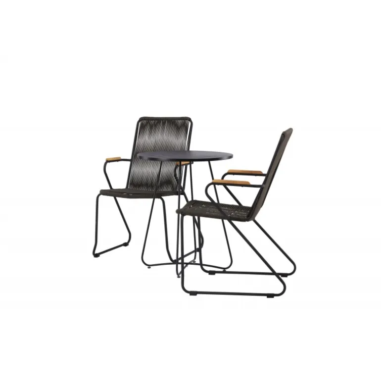 En fantastisk Loungesæt – Havemøbelsæt, der er perfekt til alle kaffepauser denne sommer! Den charmerende cafébord fra Bacong-serien har en rund bordplade og slanke ben i sort stål. Her sammen med 2 stilfulde spisebordsstole fra Bois-serien. Stolen har et komfortabelt design med armlæn i teak og mørkegrå sæde i reb. Sid behageligt og slap af denne sommer! Bordets diameter: 60 cm.