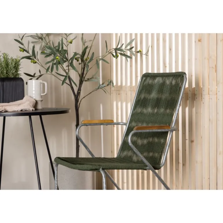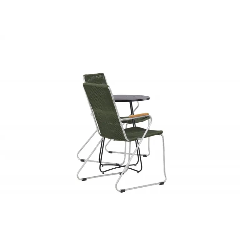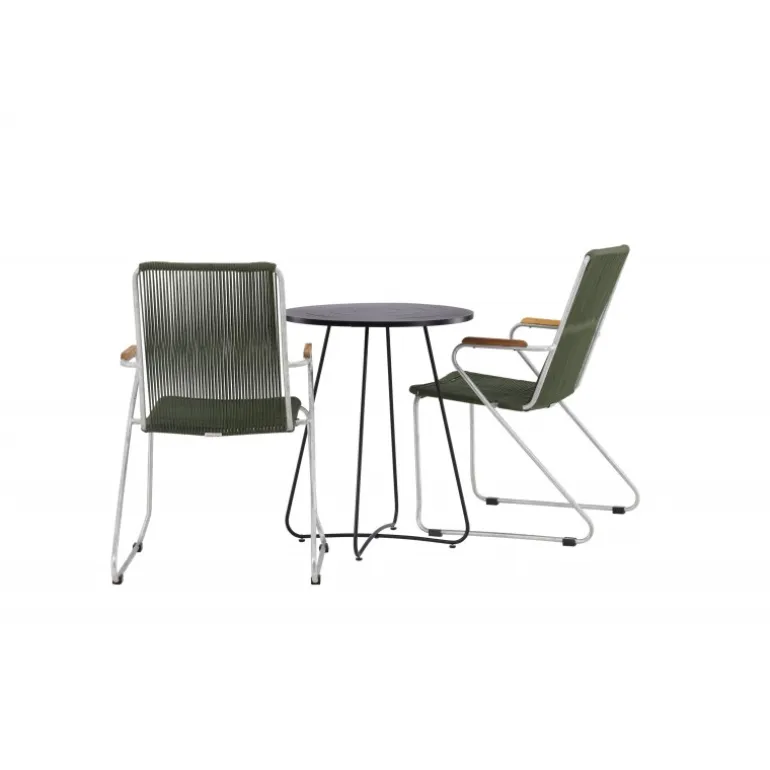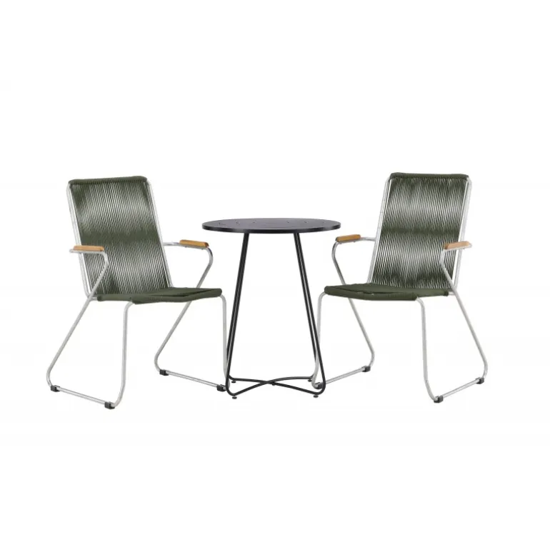 Skab en moderne og charmerende blikfang på den lille altan eller terrasse! Spisestolene fra Bois-serien har et slankt design i et tidløst look. Fremstillet af stilfuld zinkkonstruktion, sæde i slank grøn snor og dekorative armlæn i teak. Her i en stilfuld kombination med et dejligt cafébord fra Bacong-serien. Bordet har en pæn, rund top og slanke ben i sort stål. Nyd din kaffe denne sommer og oplev hyggelige øjeblikke. Bordets diameter: 60 cm.