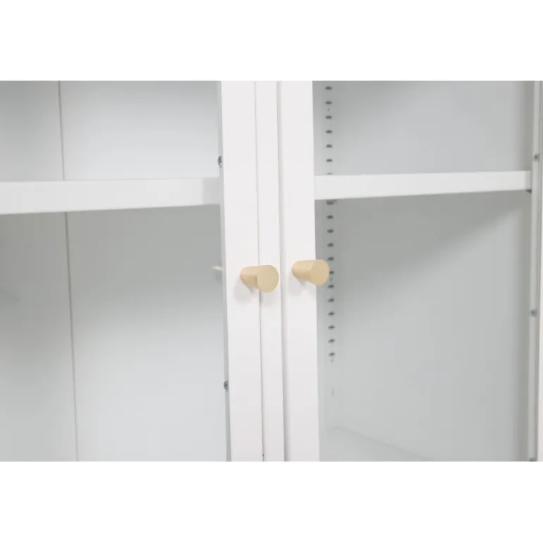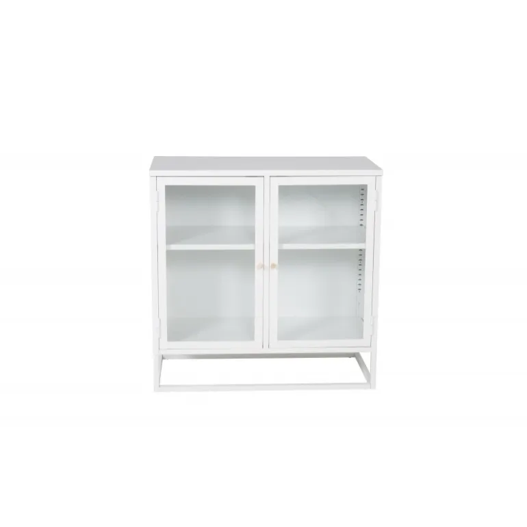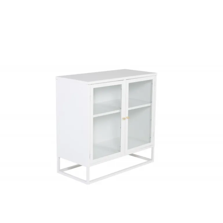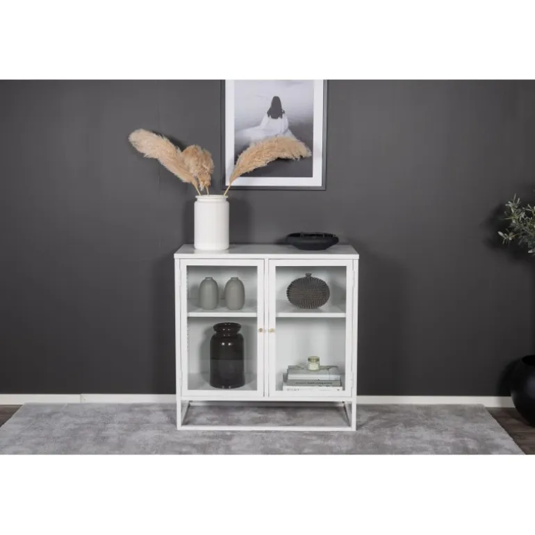 Bakal Kabinet i moderne industrielt design, fremstillet af hvid pulverlakeret stål med to glasdøre. En ramme af hvid pulverlakeret stål og to reliefoverflader. Dørene har messingfarvede knopper. Hele kabinettet hviler på en åben ramme i hvid pulverlakeret stål. Mål: Længde: 85 cm, bredde: 40 cm, højde: 85 cm. Lettere samling er påkrævet.