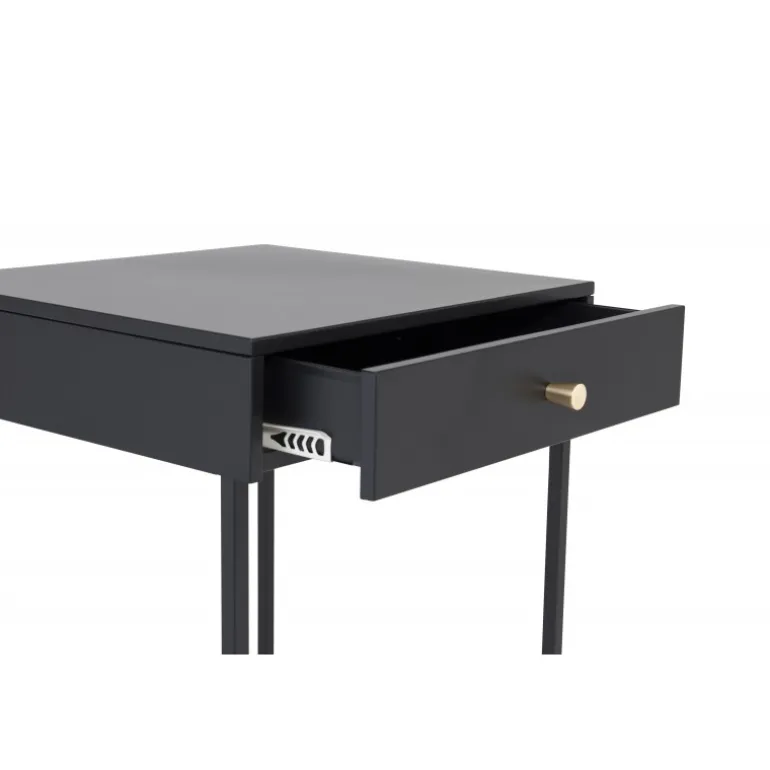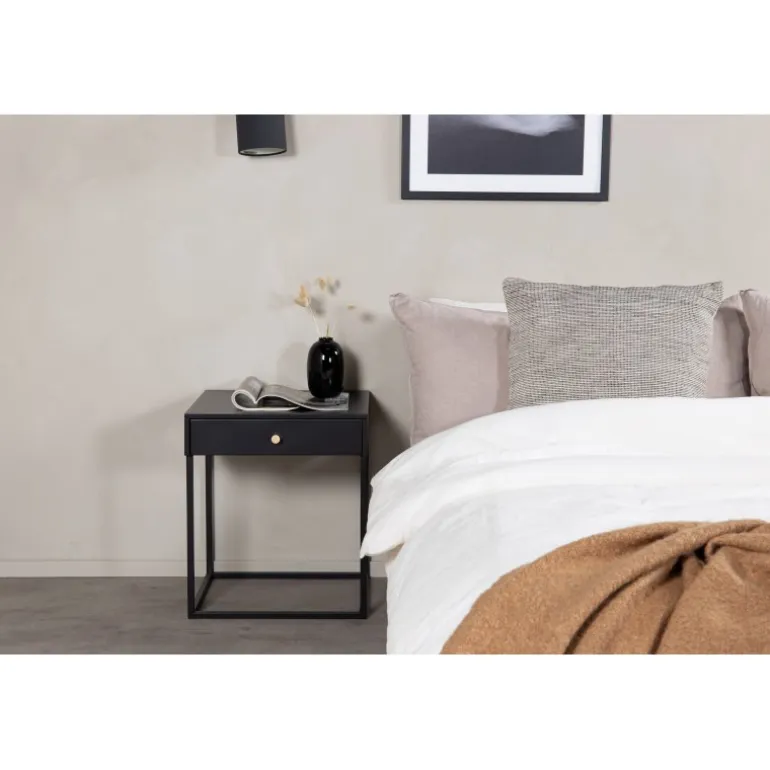 Bakal natbord i serien Bakal tilbyder alt, hvad du kunne ønske dig både praktisk og æstetisk. Med sin stilfulde, lige nordiske form er designet moderne og let. Boksen med messingknop giver glat opbevaring til alt, hvad du ønsker at have lige ved hånden. Den pulverlakerede sorte stål giver natbordet en elegant finish og gør det nemt at matche med anden indretning. Tip: Fungerer også godt som hjørnebord eller sidebord i stuen. Lettere samling er påkrævet. Plejevejledning: Aluminium og krom er to materialer, der afviser snavs og væsker. Vær dog opmærksom på, at vand kan forårsage pletter og rust. Sørg derfor for at tørre overfladen af med en blød, fugtig klud og sæbevand. Hvis pletter eller rust er for genstridige, anbefales en blød klud fugtet i ren alkohol.