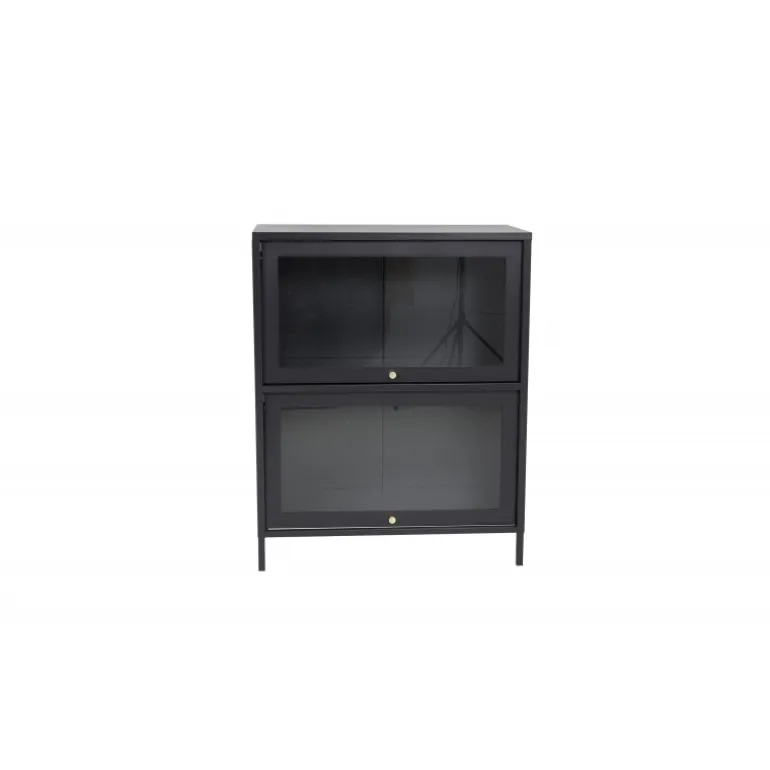 Oplev det trendy Bakal Kabinet, der er fremstillet i sort pulverlakeret stål med to glasdøre. Designet er gennemtænkt i en moderne industriel stil. De klare glasdøre lader et dejligt lys ind i skabet og er indrammet af sort pulverlakeret stål med detaljerede messingknopper. Glasdørene åbner opad. Udstillingsskabet hviler på fire smalle ben i pulverlakeret sort stål, hvilket giver skabet et luftigt udseende. Dimensioner: Længde: 80 cm, bredde: 40 cm, højde: 100 cm. Lettere samling kræves. Et elegant opbevaringsmøbel, som du kan fylde med alt fra smukt porcelæn til bøger og stilfulde interiørdetaljer. Plejeanvisning: Aluminium og krom er to materialer, der afviser snavs og væsker. Vær dog opmærksom på, at vand kan forårsage pletter og rust. Sørg derfor for at tørre overfladen af med en blød, fugtet klud og sæbevand. Hvis pletter eller rust sidder for hårdt fast, anbefales det at bruge en blød klud fugtet i ren alkohol.