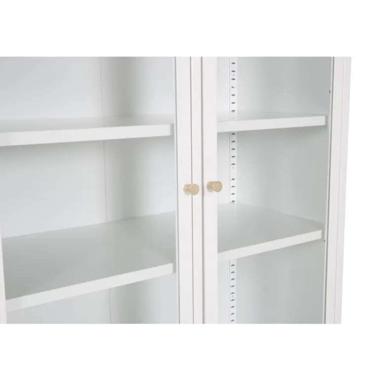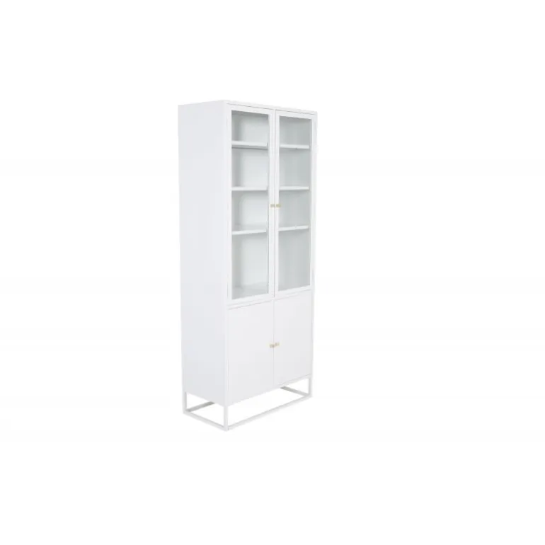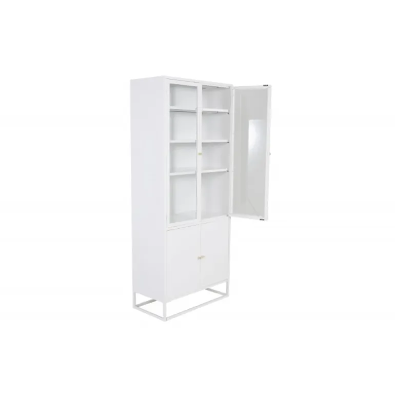 Visningsskabet er en populær tilføjelse til interiøret med elegante opbevaringsmuligheder! Skabet fra Bakal-serien har et moderne design med lige strukturer, lavet af pulverlakeret hvidt stål. Øverste del har to høje glasdøre, der giver dejligt lysindfald i skabet og fire hylder til dit fine porcelæn eller smukke interiørdetaljer. Nederste del har to døre i pulverlakeret hvidt stål med to hylder til skjult opbevaring. Et visningsskab, der tilbyder det bedste fra to verdener – vælg, hvad du vil vise frem, og hvad der skal have smart opbevaring. Lettere samling kræves. Plejeråd: Aluminium og krom er to materialer, der afviser snavs og væsker. Dog skal du være opmærksom på, at vand kan forårsage pletter og rust. Sørg derfor for at tørre overfladen af med en blød fugtig klud og sæbevand. Hvis pletter eller rust sidder for hårdt, anbefales en blød klud fugtet i ren alkohol.