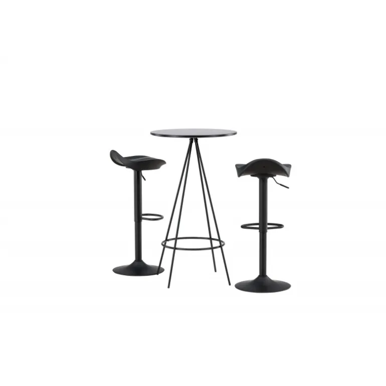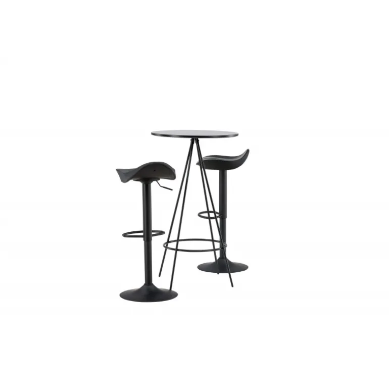 Hvorfor ikke indrette dit hjem så moderne som tidløst? Bistro barbordet har et minimalistisk, skandinavisk design med en rund bordplade i sort MDF med finer. De luftige, kegleformede bordben er let udadvendte i sort metal og har en integreret ramme til fodstøtten. Her sammen med klassiske, sorte barstole fra Adesto-serien. Stolen har et stilfuldt design med en trompetfod i sort stål og et enkelt sæde i sort plast. Her får du alt hvad du behøver! Bordets dimensioner: 60cm.