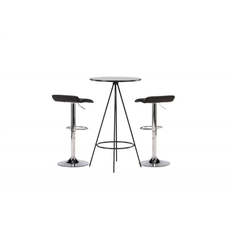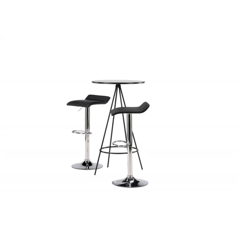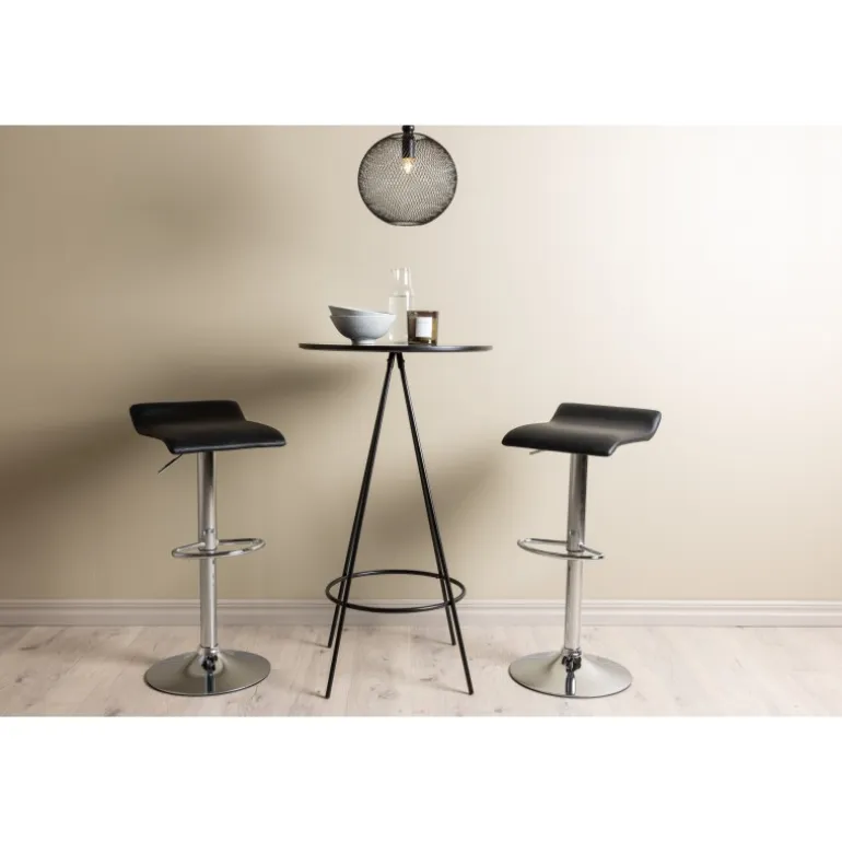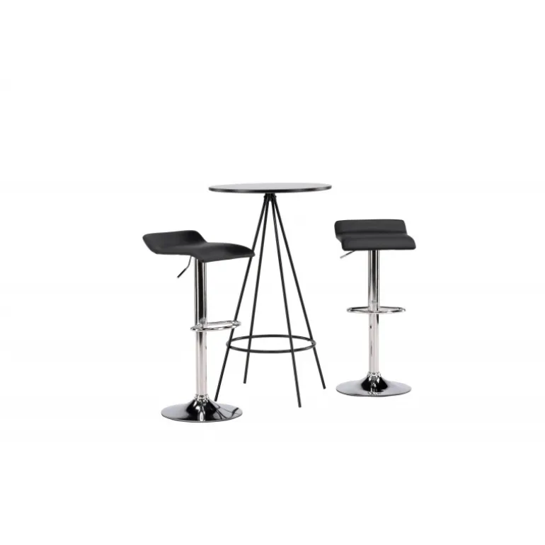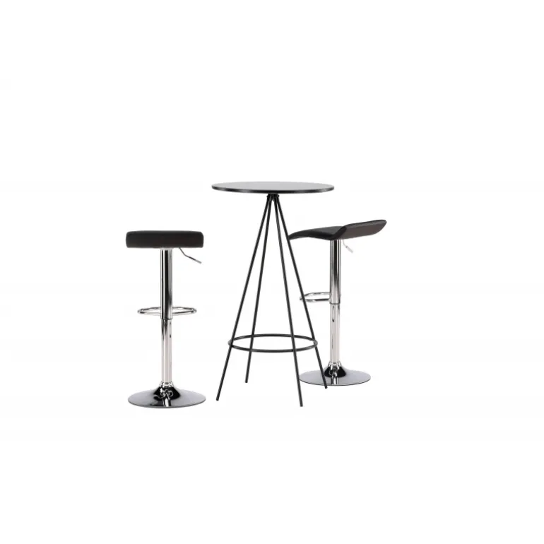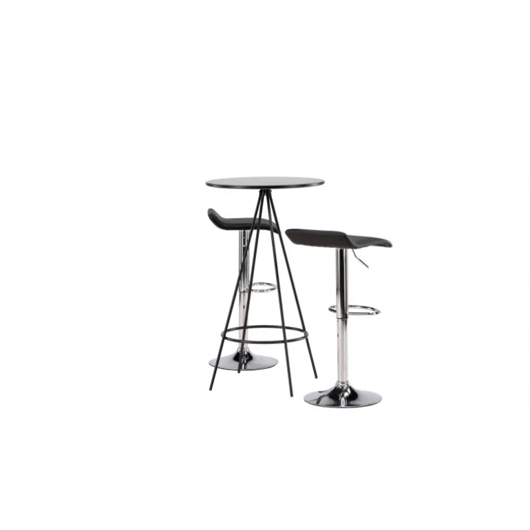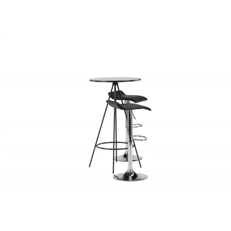 Trendy bargruppe med alle de rette funktioner! Bistro barbordet har et minimalistisk, skandinavisk design med en rund bordplade i sort MDF med finer. De luftige, kegleformede bordben er let udvidet i sort metal og har en integreret ramme til fodstøtte. Her i kombination med sorte barstole fra Jonna-serien. Stolen har et stilfuldt design med en trompetfod i kromet stål og et enkelt sæde i sort kunstlæder. Det bliver ikke bedre end dette! Bordmål: 60 cm.