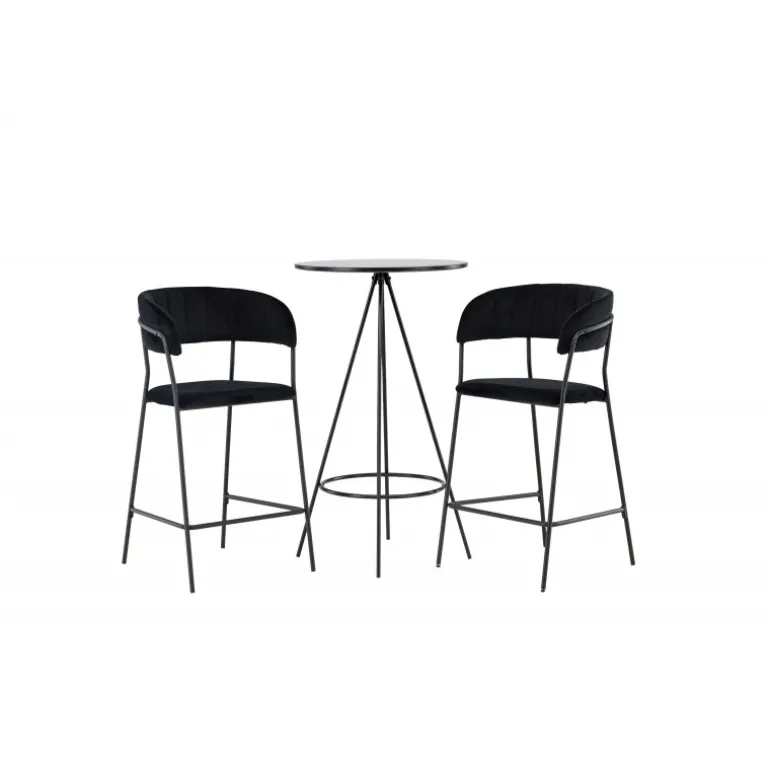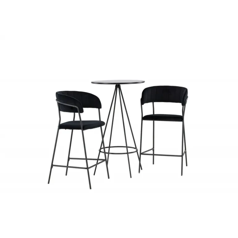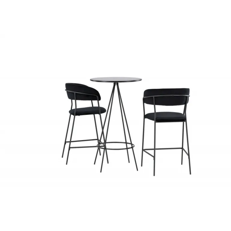 Det bliver ikke bedre end dette! Bistro barbordet har et minimalistisk, skandinavisk design med en rund bordplade i sort MDF med finér. De luftige, kegleformede bordben er let udadbuede i sort metal og har en integreret ramme til fodstøtten. Her i stilfuld kombination med komfortable barstole fra Lui-serien. Stolen har et fuldt polstret design med en let rundet ryg og sæde i kunstlæder med stilfulde dekorative syninger, og stolens ben er smalle i sort stål med integreret fodstøtte – garanteret lige så stilfuld som komfortabel. Bordets dimensioner: 60 cm.