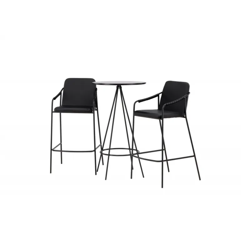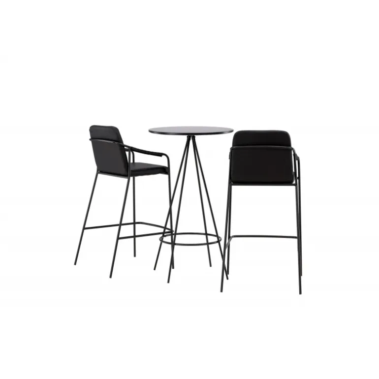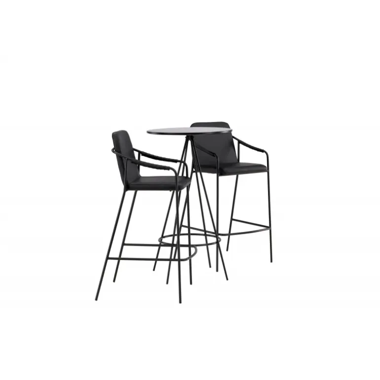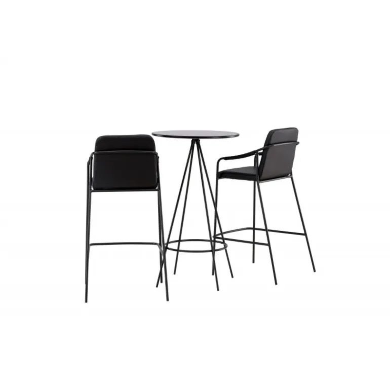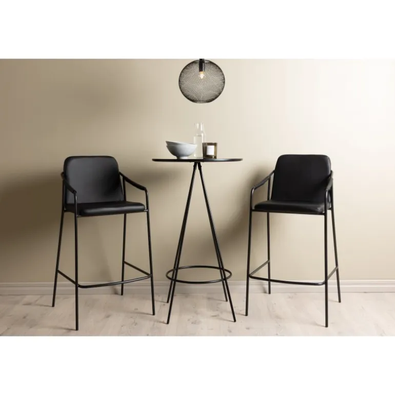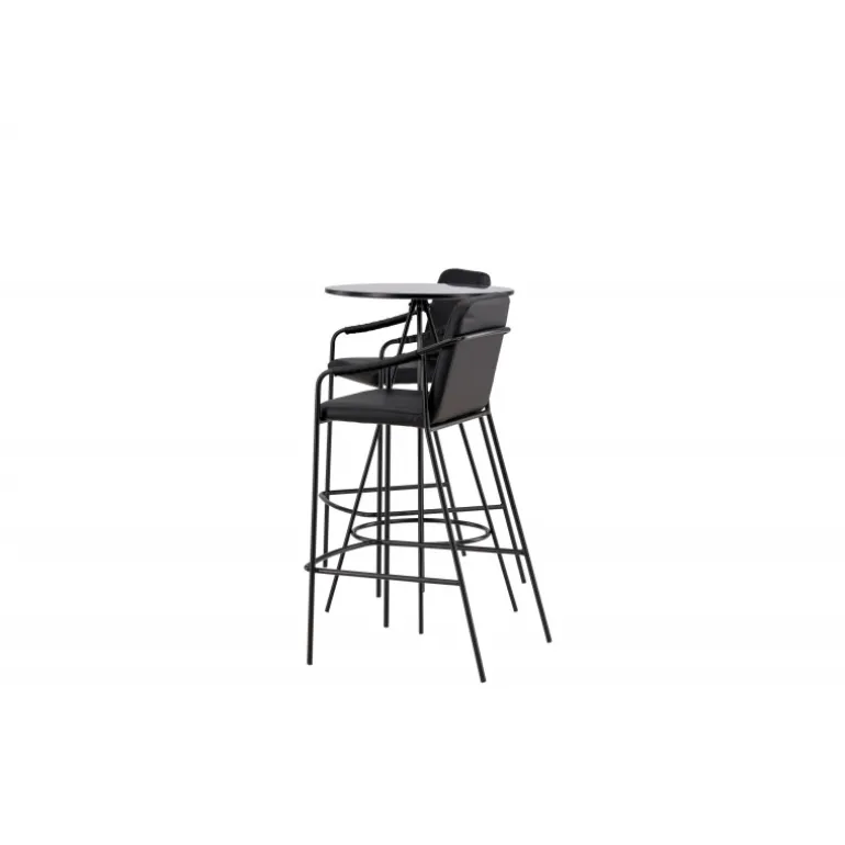 Det bliver ikke en bedre kombination end dette! Bistro barbordet har et minimalistisk, skandinavisk design med en rund bordplade i sort MDF med finer. De luftige, kegleformede bordben er let udadgående i sort metal og har en integreret ramme til fodstøtten. Her sammen med sorte barstole fra serien Tvist. Stolen har et polstret sæde og fuldt polstret design i sort PU med minimalistiske stoleben og integrerede armlæn i sort stål. Det skal føles lige så indbydende som det er komfortabelt! Bordets dimensioner: 60 cm.