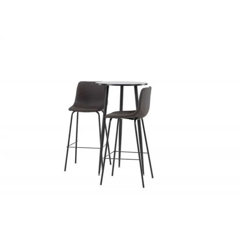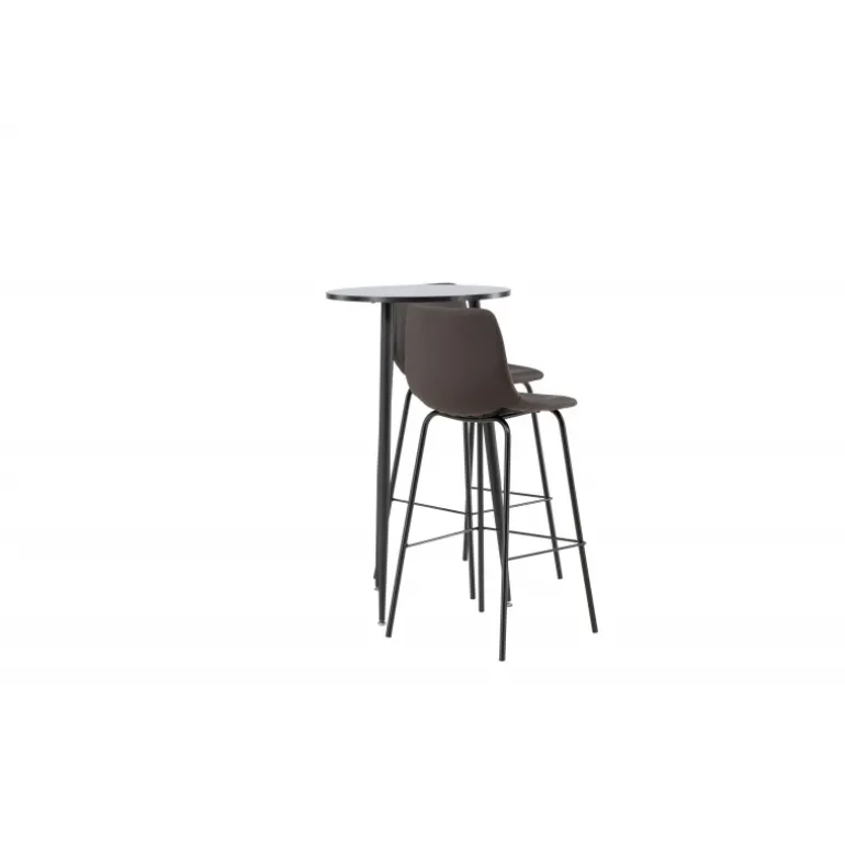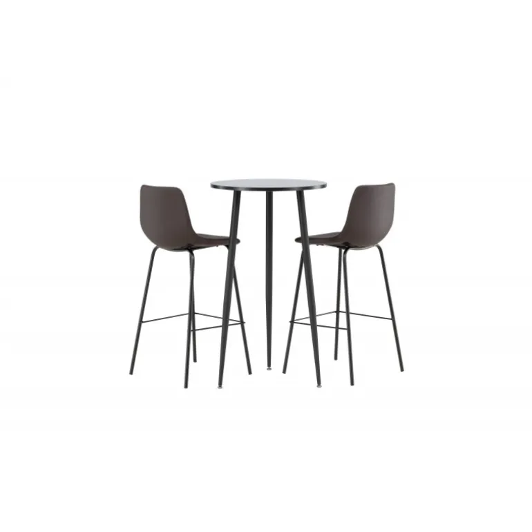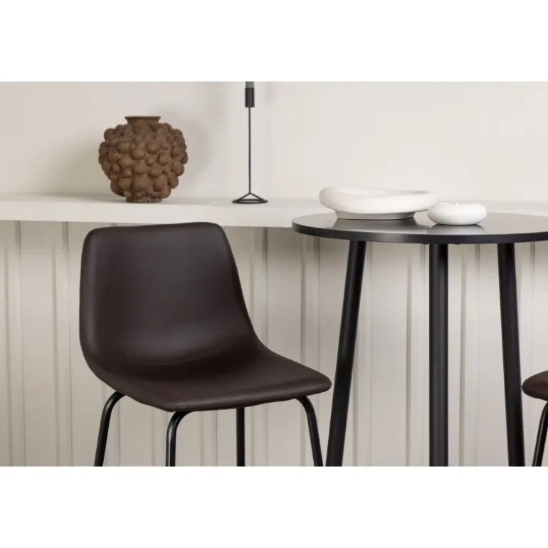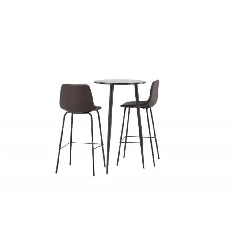 Oplev komfort og stil med vores Bar sæt Plaza med stole Alexi. Dette elegante barbord har en rund bordplade i sort MDF og let udskårne ben i sort metal. Sættet kommer med brune barstole fra Alexi-serien, som er fuldt polstret i brun polyurethanlæder og polyester. De smalle ben i sort pulverlakeret metal har en integreret fodstøtte for ekstra komfort. Gør dit hjem smart og moderne! Bordets dimensioner: 60 cm i diameter.