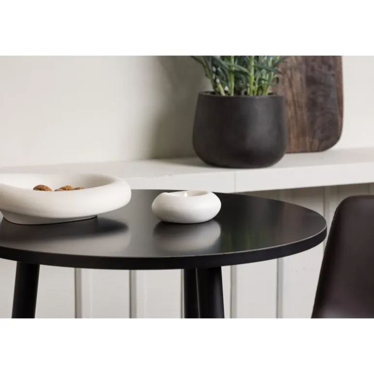 - Stilfuldt design: Rund bordplade i sort MDF og let udskårne ben i sort metal.