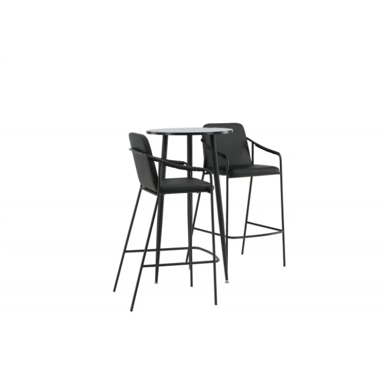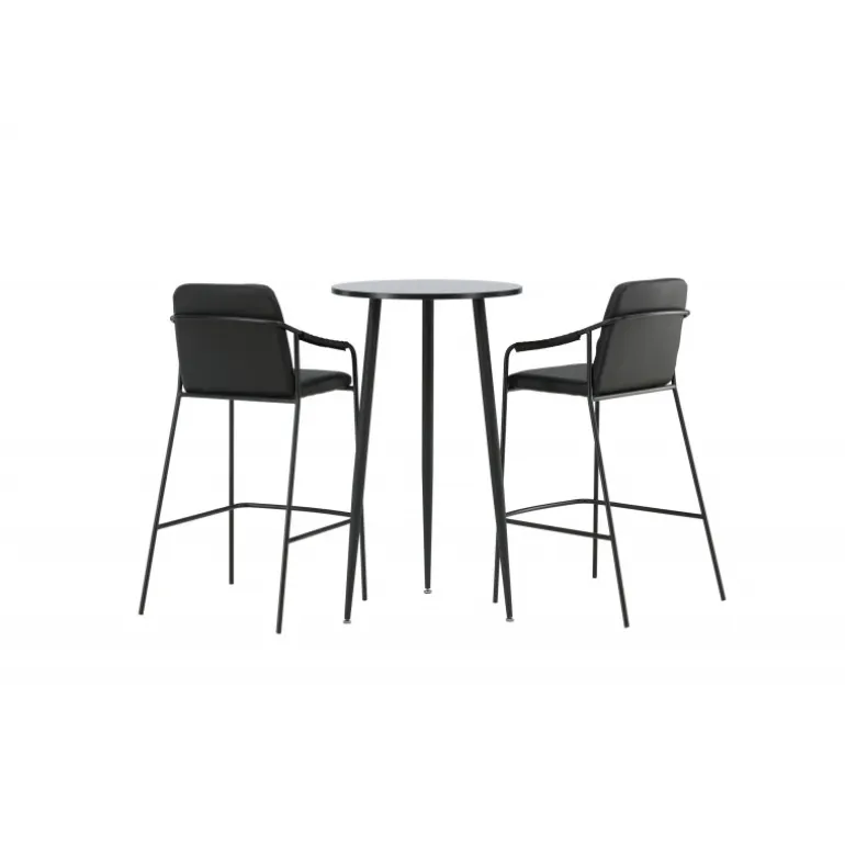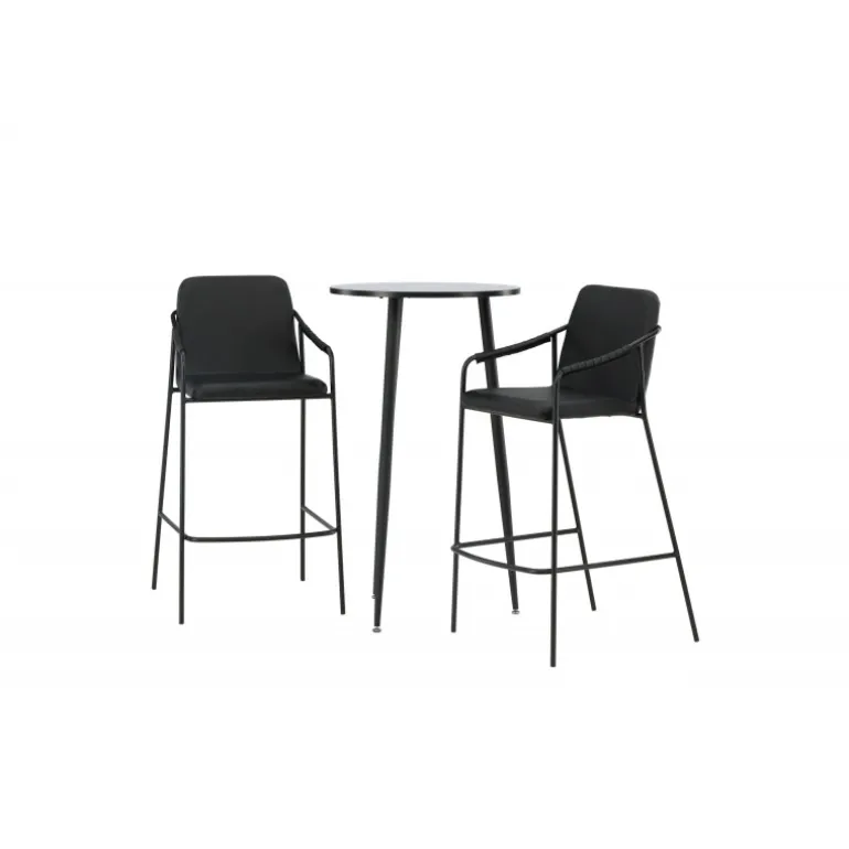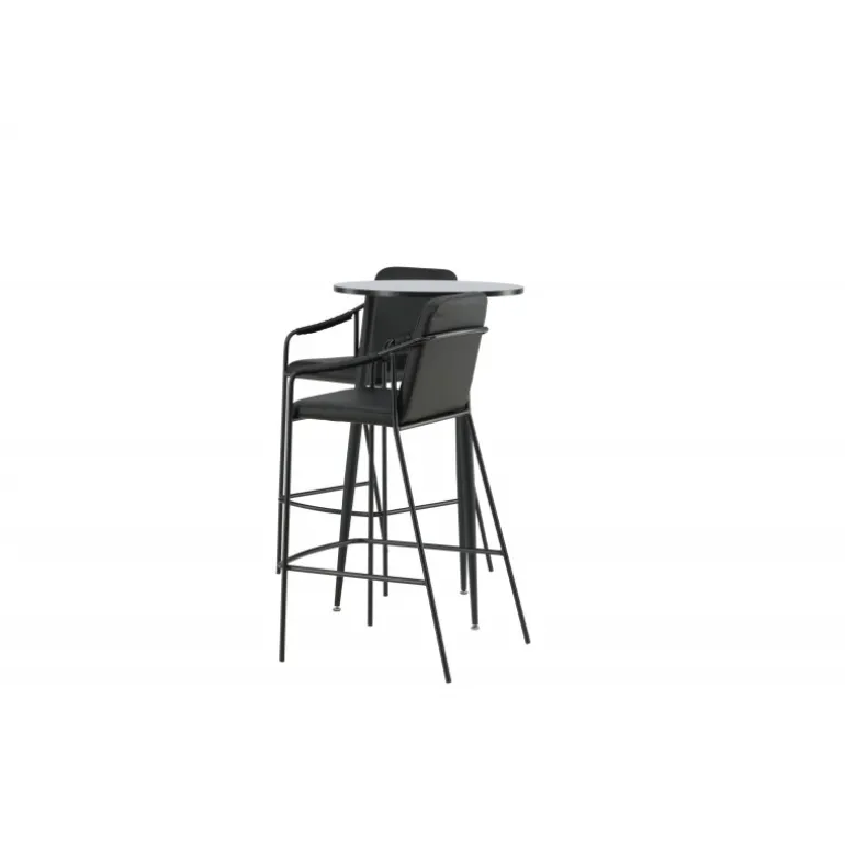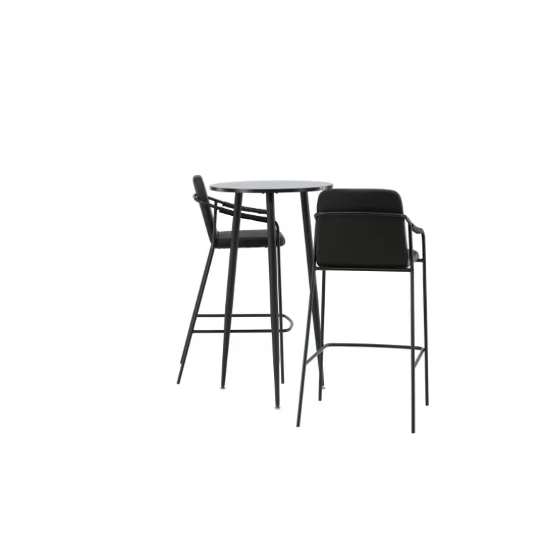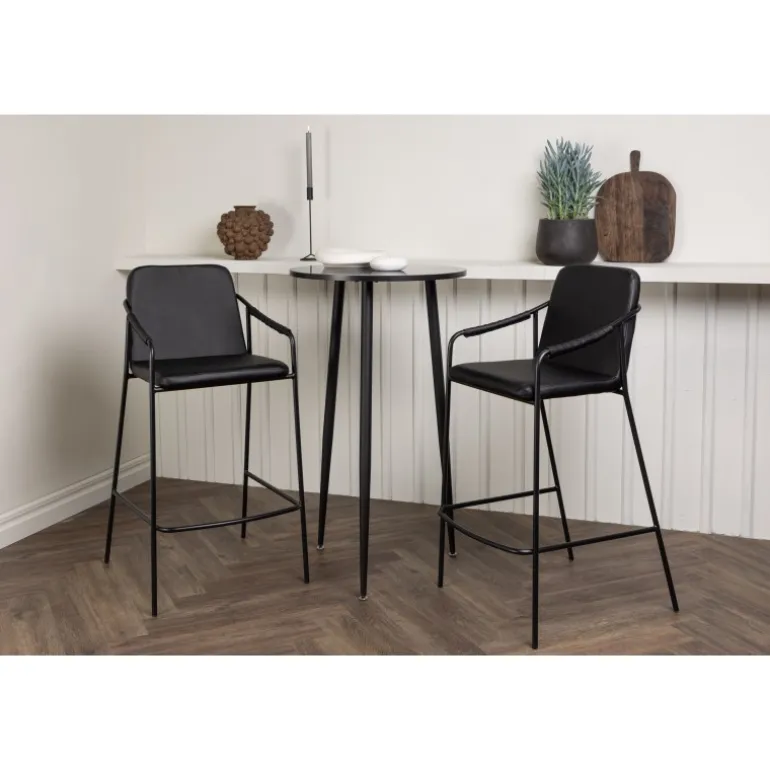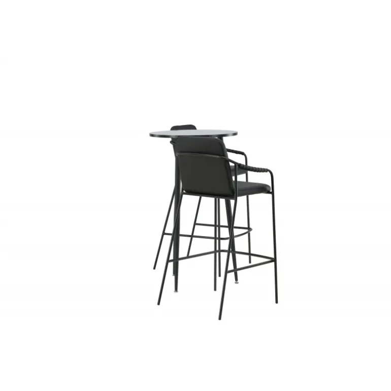 En næsten uovertruffen kombination til det lille køkken! Det vidunderlige Plaza barbord har en rund bordplade i sort MDF, og benene er let skråtstillede i sort metal. Her sammen med sorte barstole fra serien Tvist. Stolen har et polstret sæde og fuldt polstret design i sort PU med minimalistiske stoleben og integrerede armlæn i sort stål. Simpelthen lige så stilfuldt som smart! Bordets diameter: 60 cm.