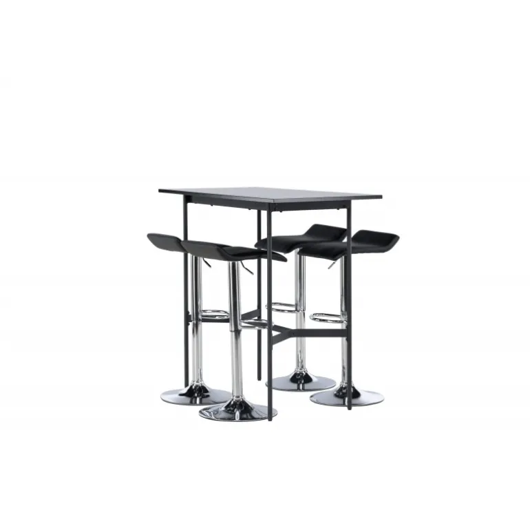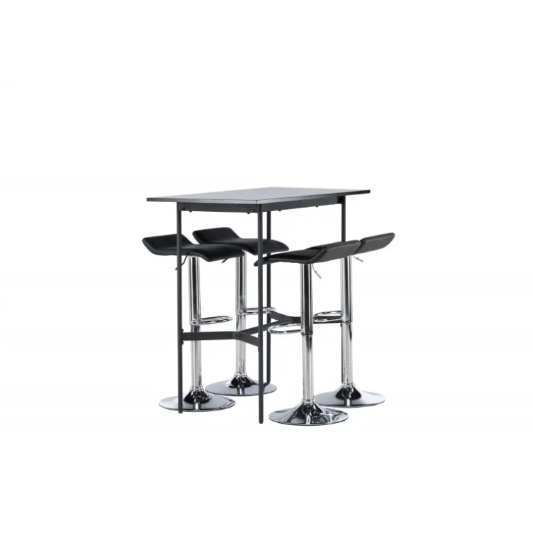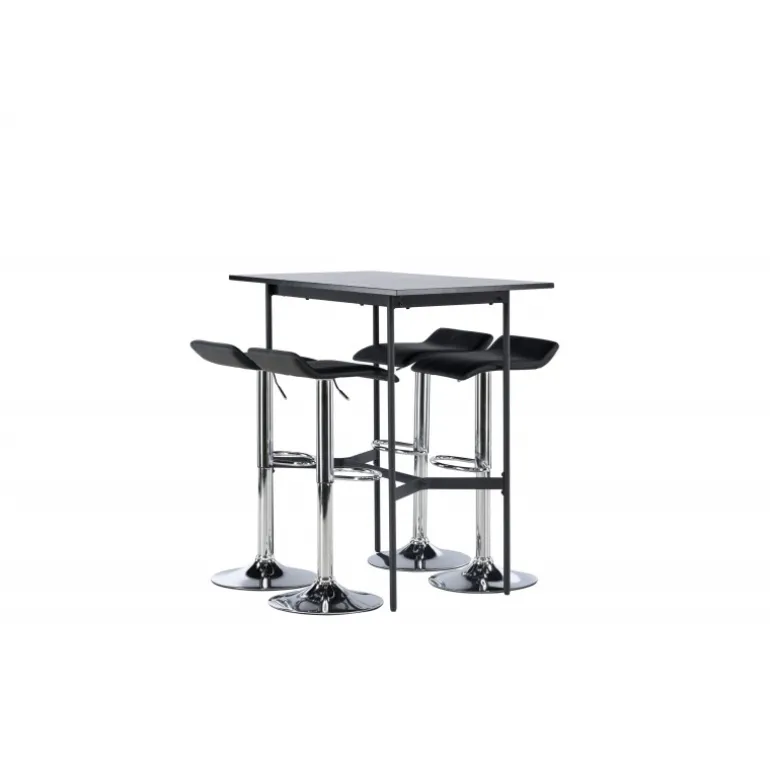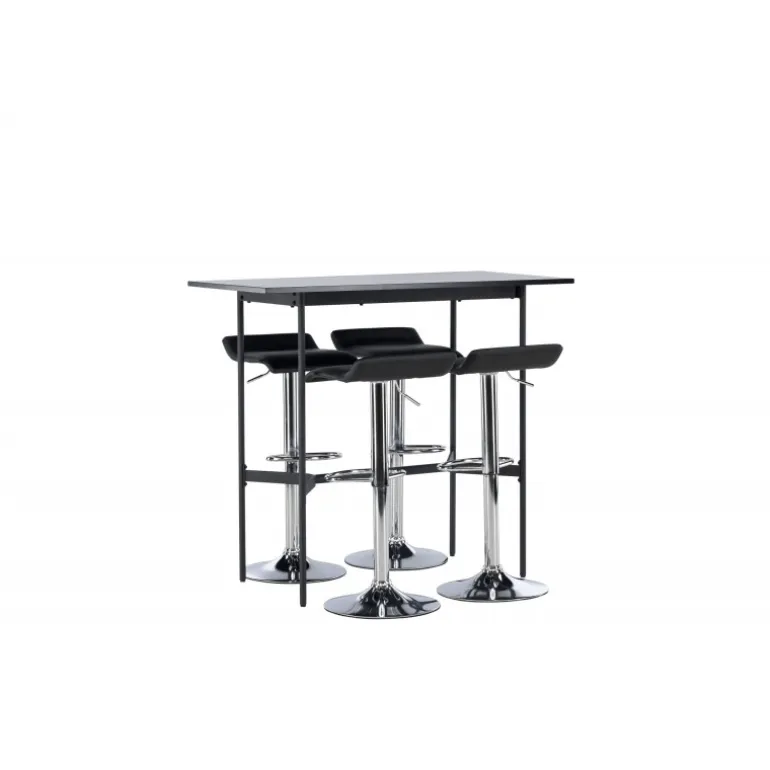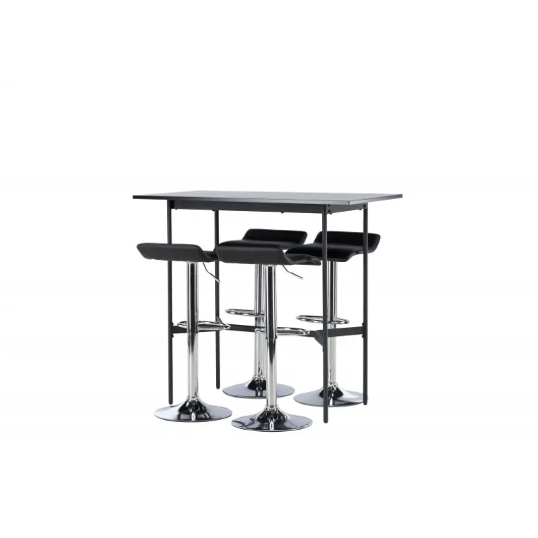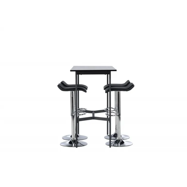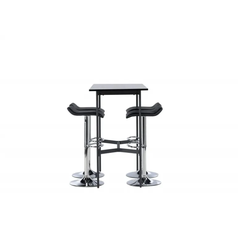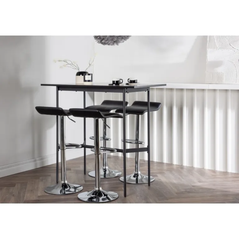 Et strømlinet barsæt med et trendy design! Det minimalistiske barbord Rax har en tynd bordplade i sort MDF og slanke bordben med integreret fodstøtte i sort metal. Her i kombination med sorte barstole fra Jonna-serien. Stolen har et stilfuldt design med en trompetfod i forkromet stål og et enkelt sæde i sort kunstlæder. Tag din indretning til nye højder! Bordmål: 120x60cm.