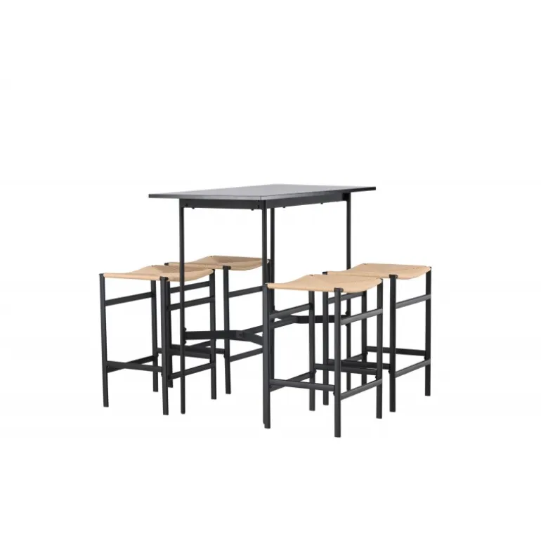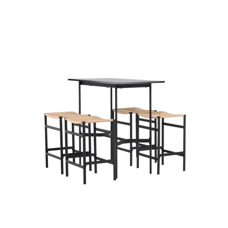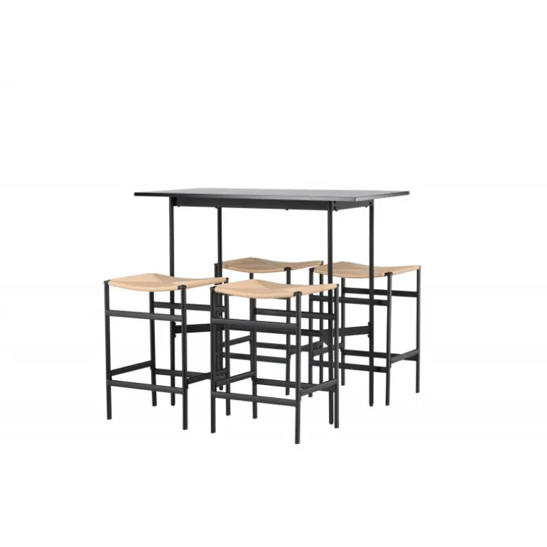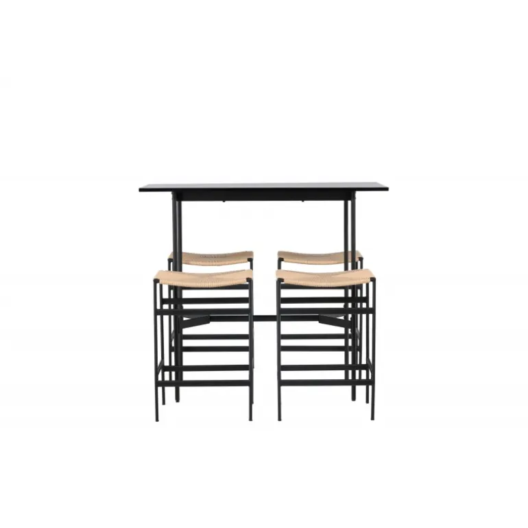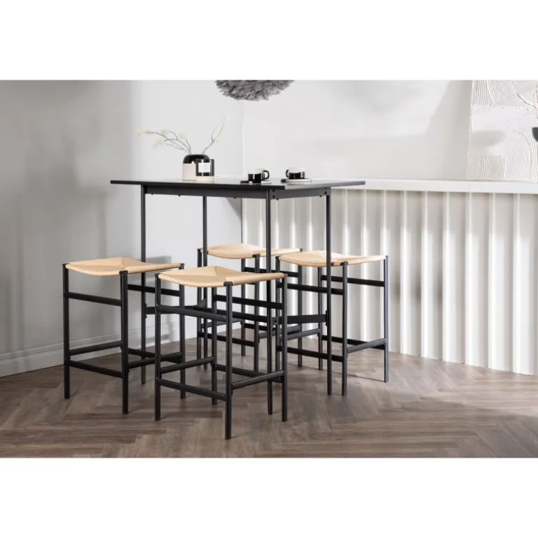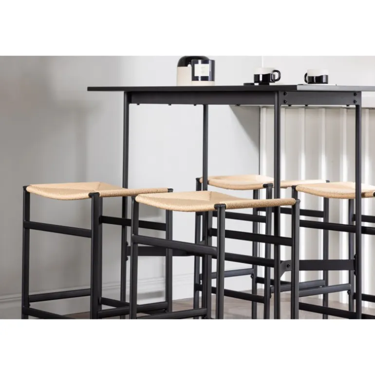 Oplev en stilfuld kombination af boheme og industrielt design med vores bar sæt Rax med stole Polly! Det minimalistiske barbord Rax har en tynd bordplade i sort MDF og smalle bordben med integreret fodstøtte i sort metal. Hertil får du moderne barstole fra Polly-serien. Stolen har en smart farvekombination med sæde i naturfarvet reb og lige ben med integreret fodstøtte i sort gummitræ. Hvilket utroligt match! Bordmål: 120×60 cm.