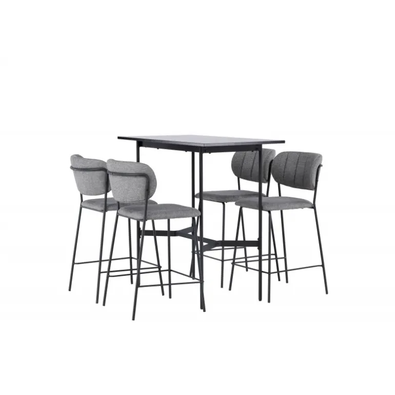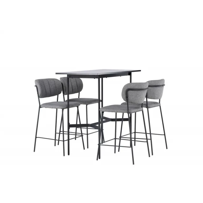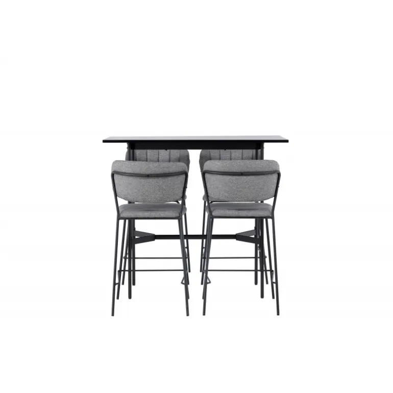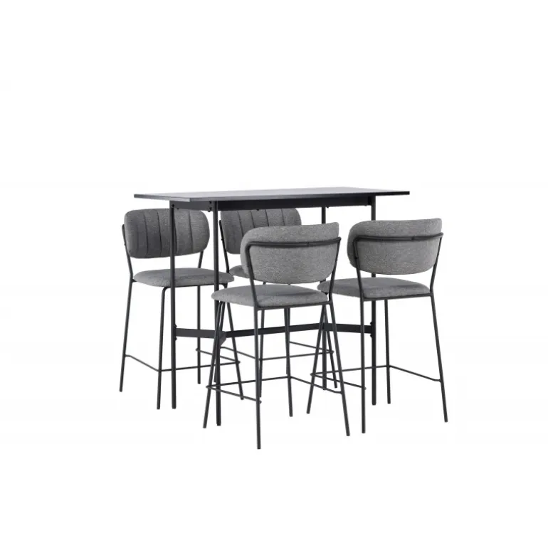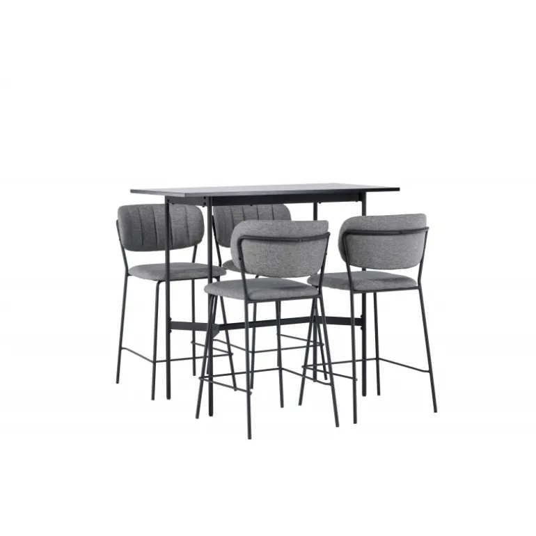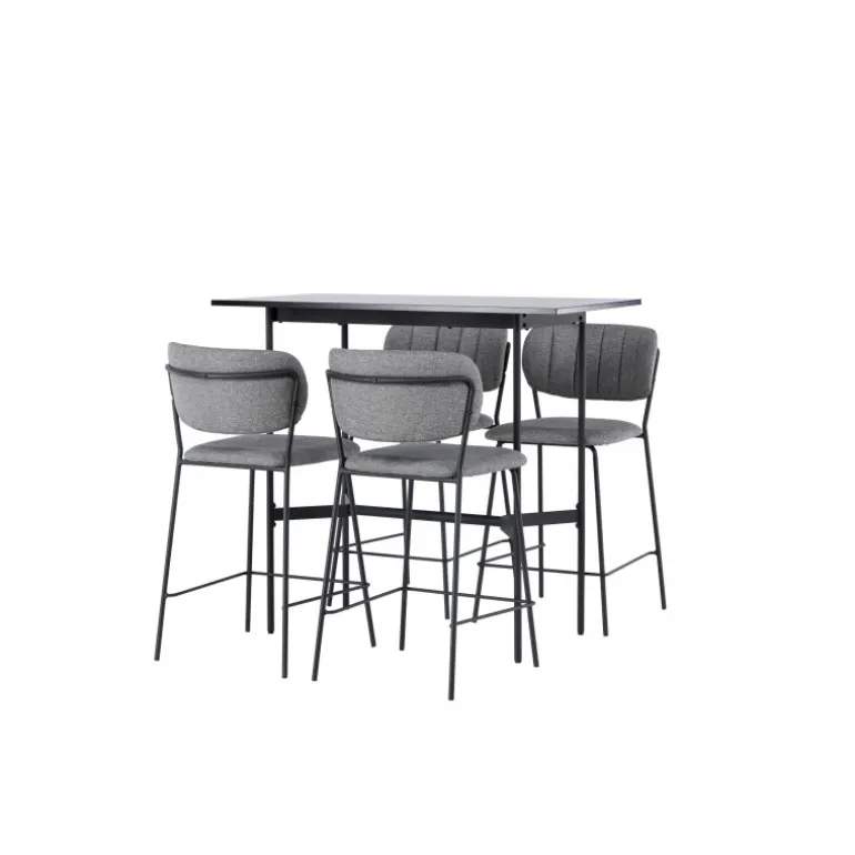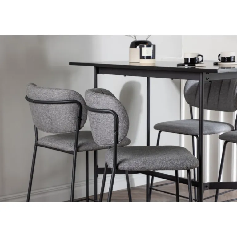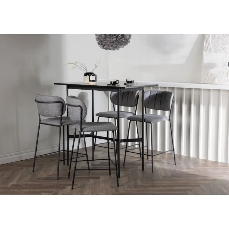 Stilfulde former og skandinavisk design – en perfekt kombination! Det minimalistiske barbord Rax har en tynd bordplade i sort MDF og smalle bordben med integreret fodstøtte i sort metal. Her sammen med grå barstole fra Bell-serien. Stolen har et fuldt polstret design med en let afrundet ryg og sæde i gråt polyesterstof med stilfulde dekorative syninger, og stolebenene er smalle i sort stål med integreret fodstøtte. Det bliver næppe bedre end dette! Bordmål: 120x60cm.