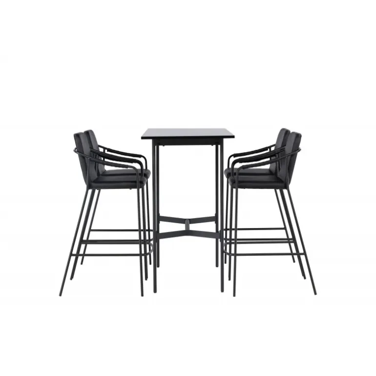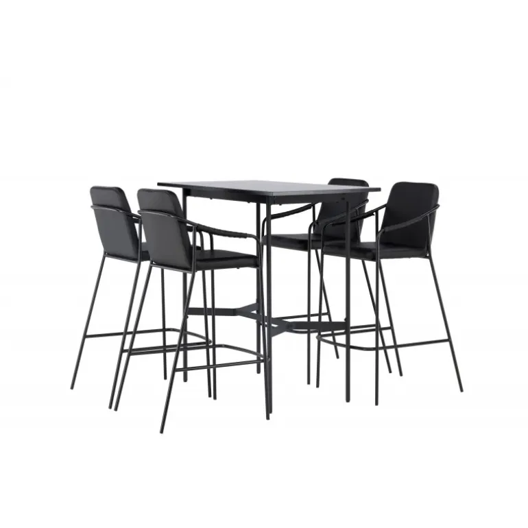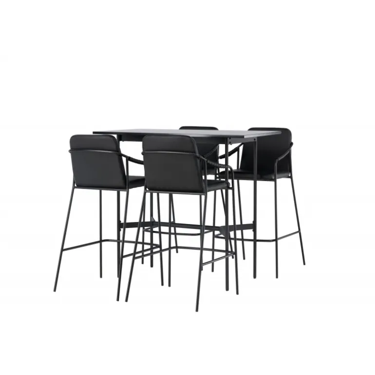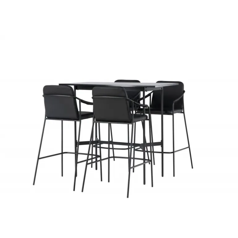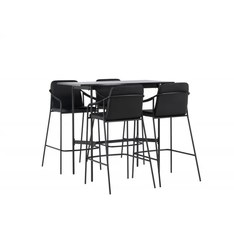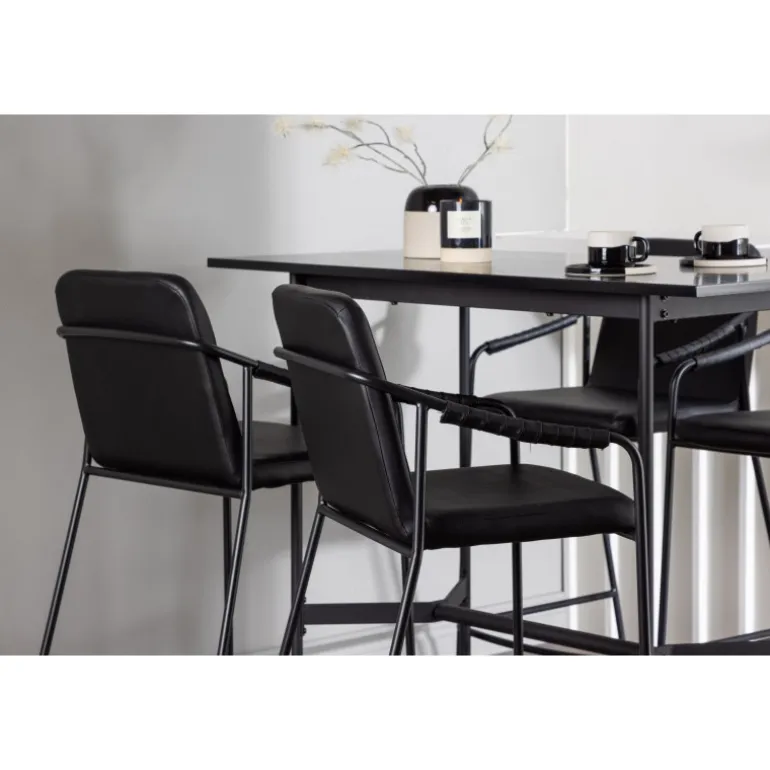 En kombination skabt til hinanden! Den minimalistiske barbord Rax har en tynd bordplade i sort MDF og smalle bordben med integreret fodstøtte i sort metal. Her sammen med sorte barstole fra serien Tvist. Stolen har en polstret sæde og fuldt polstret design i sort PU med minimalistiske stoleben og integrerede armlæn i sort stål. Det industrielle look er fremragende både i køkkenet og i stuen! Bordmål: 120x60cm.