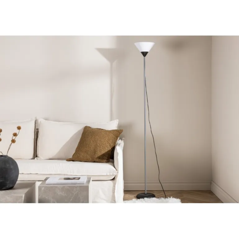 Den perfekte gulvlampe til stuens hyggelige hjørne! Batang har et smukt og graciøst design med sin tynde og lige stil, der passer ind i de fleste rum og husstande. Lampen har en dejlig lysegrå farve på standen, kombineret med en sort fod og hvid skærm, hvilket skaber et stilfuldt og moderne indtryk!