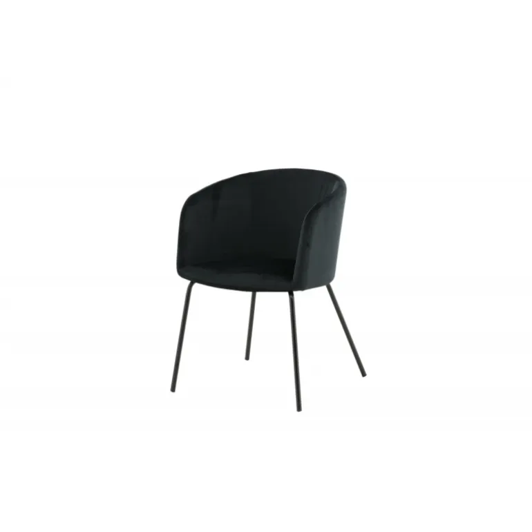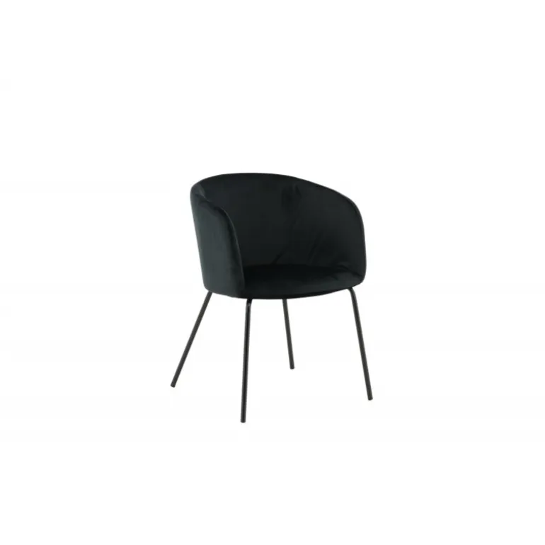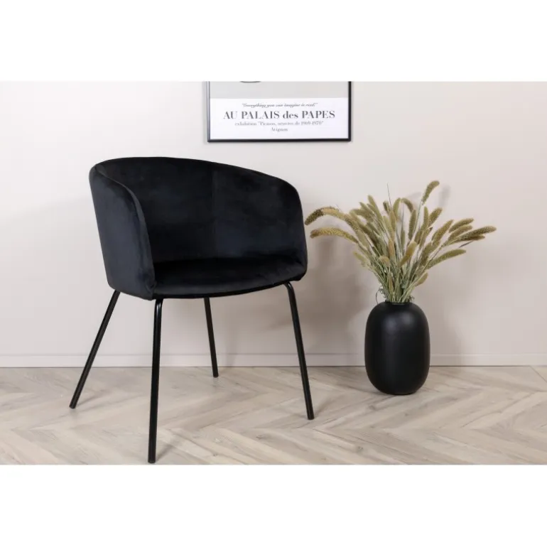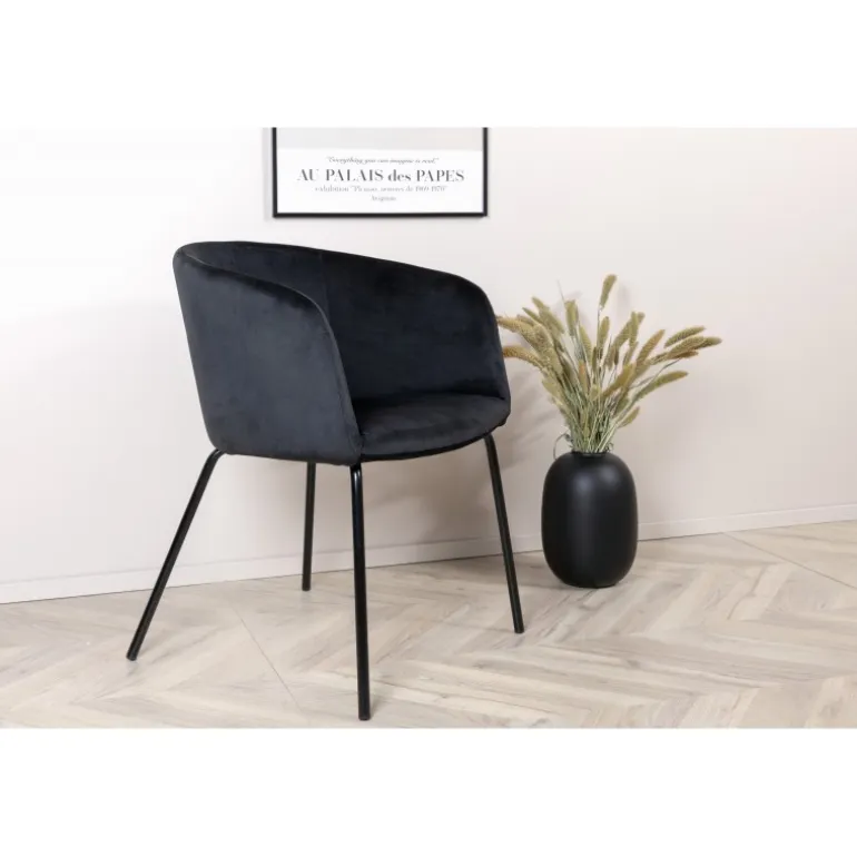 Indret hjemmets hjerte med en moderne, komfortabel og tidløs stol fra serien Berit i en iøjnefaldende sort farve! Denne spisestol har et fuldt polstret design med en let afrundet ryg og sæde i fløjlstof og polyesterlinned samt slanke ben i sort jern – garanteret både flot og behagelig. Skab et indbydende og hyggeligt udtryk og nyd dejlige måltider sammen! Lettere montering er påkrævet. Plejevejledning: Fløjl har en tendens til at få trykmærker, når luv ligger ned. Disse aftryk kan få stoffet til at se slidt ud, hvilket er helt normalt for denne type materiale. Afhængig af lysindfaldet kan stoffet ændre farve i forskellige nuancer.