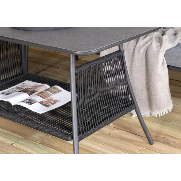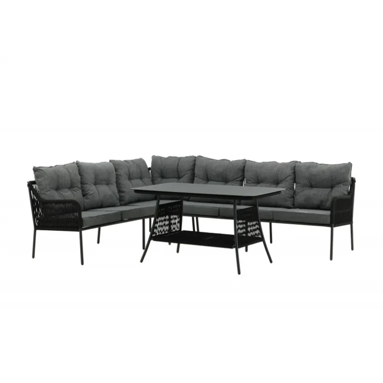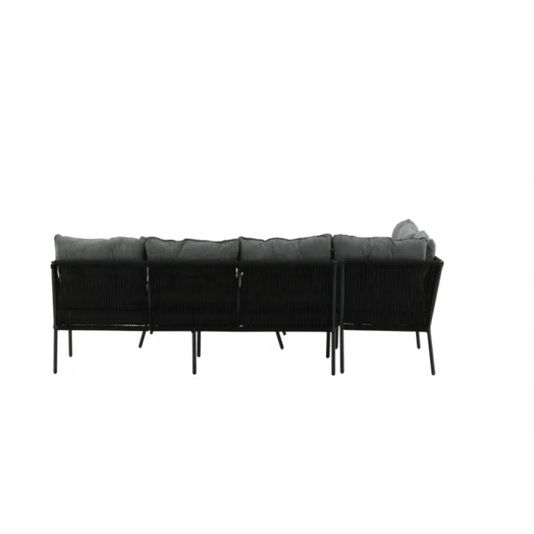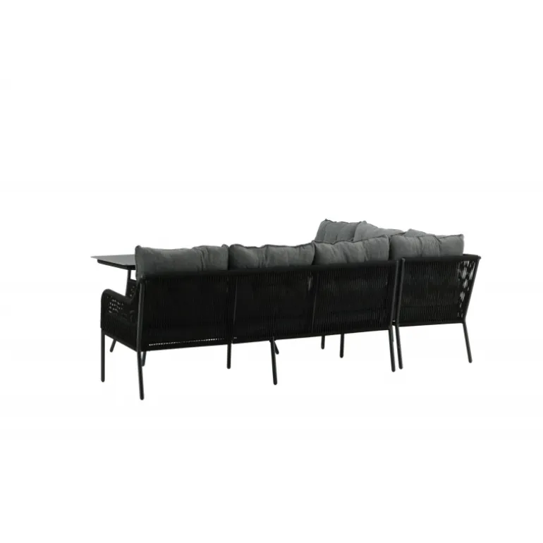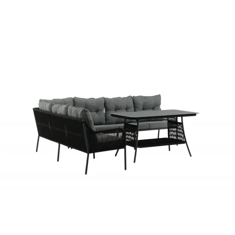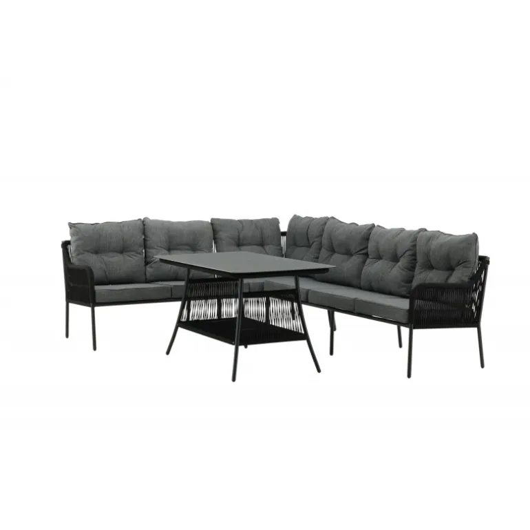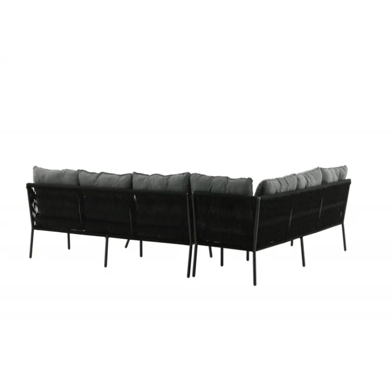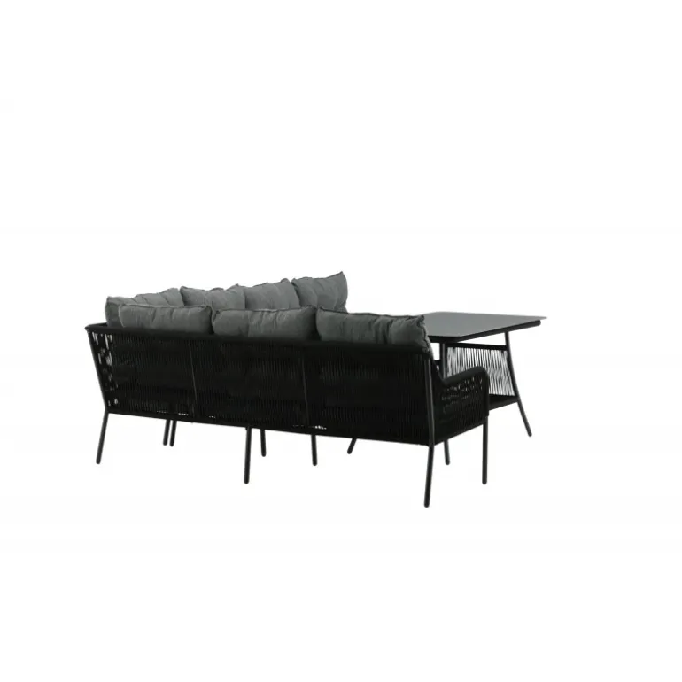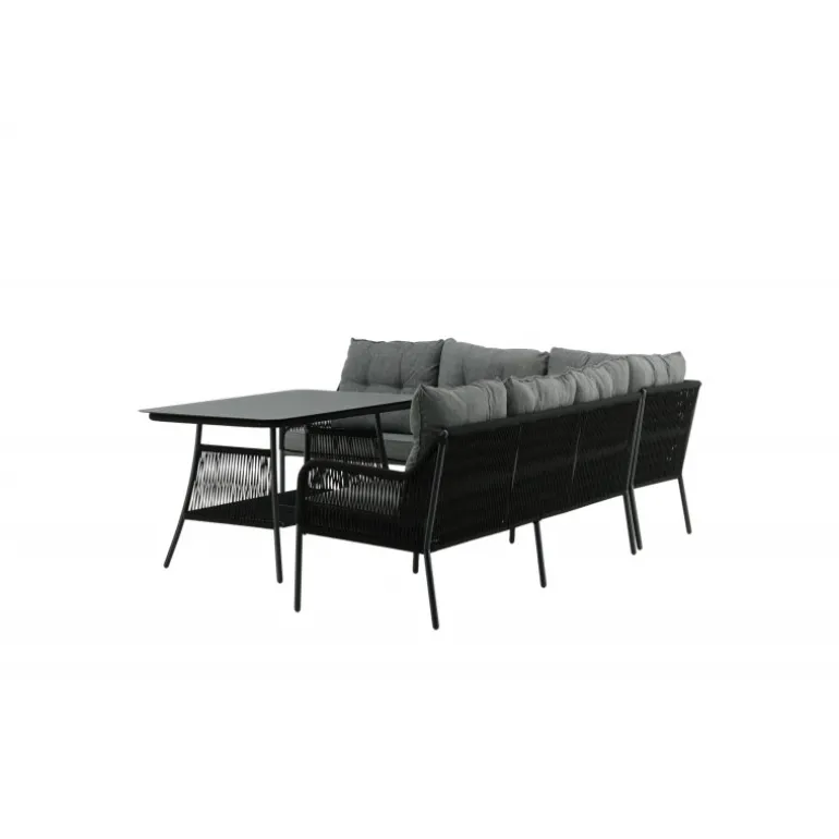 Skab en indbydende oase på din terrasse denne sommer! Berlin sofa gruppen er en flot og stilfuld gruppe i sort stål og flettet reb med tilhørende, matchende sofabord, der har en elegant glasplade. Holdbare puder i grå er inkluderet, og gruppen har plads til i alt 6 siddende gæster. Bordmål: 120x70x66 cm. Sofamål: 193/173×63,5×69,5 cm. Sædemål: 178/169x52x32 cm. Nemmere montering er påkrævet. Her kan du og dine gæster nemt nyde sene sommeraftener! Plejeanvisning: Vores reb er af høj kvalitet spundet polyester, der er let at rengøre. Møblerne er behandlet til at modstå 500-2000 timer. Vi anbefaler sæbe og vand til rengøring. Lad det lufttørre. Til de områder, der er sværere at nå, kan en lille børste bruges forsigtigt. Brug aldrig højtryksrenser eller stærke kemikalier til at rengøre rebet.