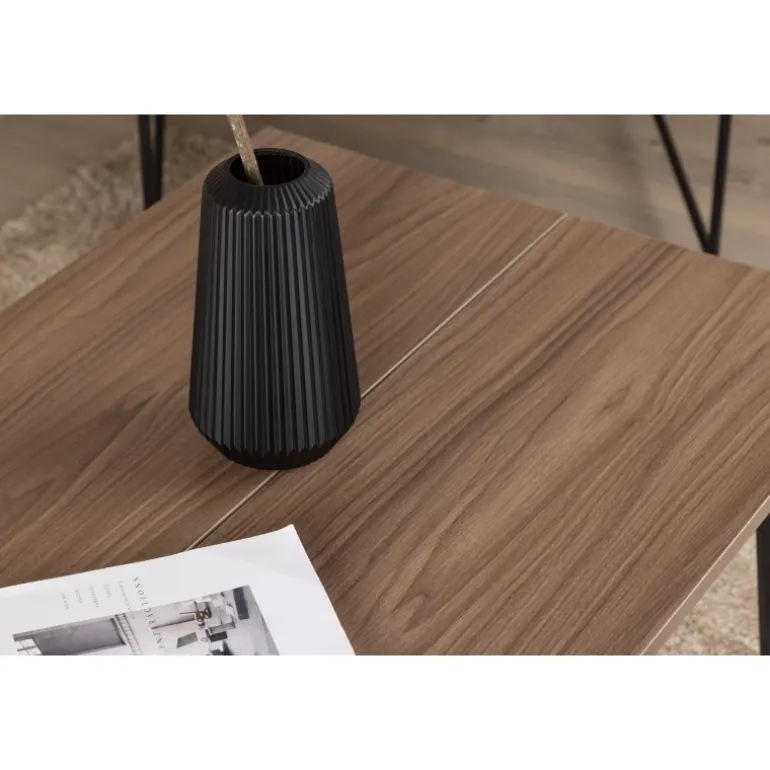 - Materialer af høj kvalitet: Valnødfarvet MDF-bordplade og sort stålunderdel sikrer langvarig holdbarhed.