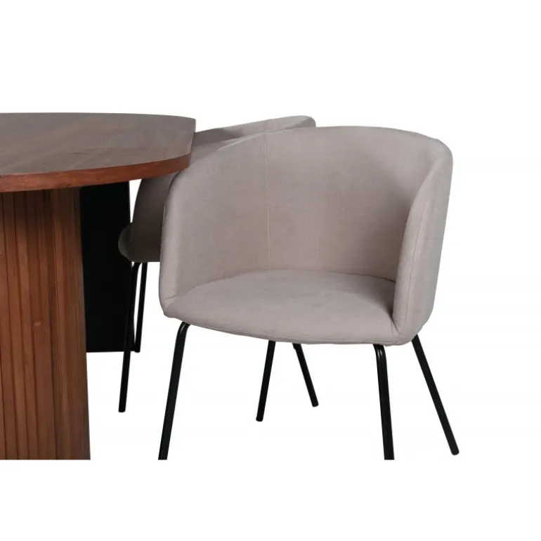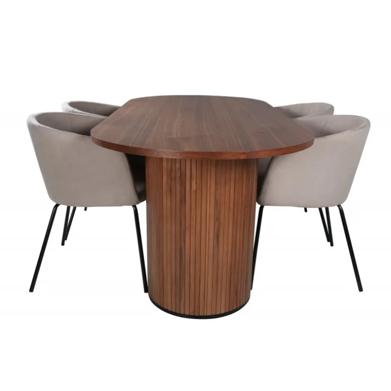 Pompøst og elegant – tilføj et moderne touch til dit interiør! Vores ovale spisebord Bianca i trendy valnødde farver passer perfekt både i stuen og det rummelige køkken. Bordpladen er lavet af valnøddefarvet MDF med finer og en robust krop i både valnødde- og sort farvet træ og MDF i et ribbet design, der giver et stabilt indtryk. Bordmål: Længde: 200 cm, Bredde: 90 cm, Højde: 75 cm. Matchet her med 4 Berit spisebordsstole i luksuriøst design. Sædet er blødt i beige polyester linned, og stolens ben er stilfuldt smalle i sort jern. Stolemål: Højde: 78 cm, siddehøjde: 49 cm, bredde: 55 cm, dybde: 55 cm. Skab en indbydende blikfang i hjertet af hjemmet!