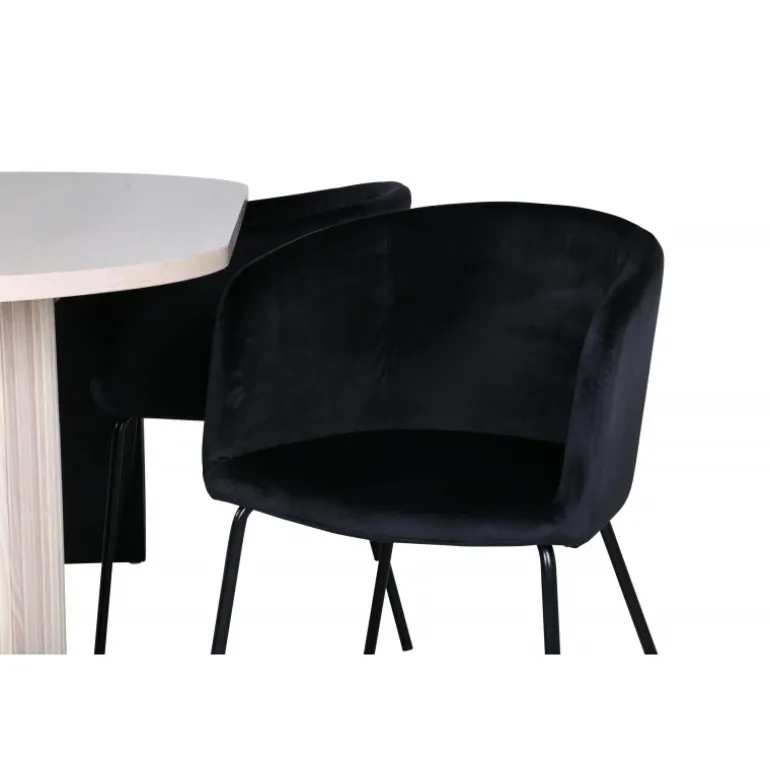 Bianca skaber en stilfuld blikfang, der imponerer! Dette ovale spisebord i en pudset hvid farve har et moderne design med en bordplade i knoglehvid MDF med finer og en robust ramme i hvidt og sort træ samt MDF i ribbet design, der giver et solidt indtryk. Bordets dimensioner: Længde: 200 cm, Bredde: 90 cm, Højde: 75 cm. Matcher her sammen med 4 af vores stilfulde spisestole Berit i et indbydende design. Stolene fokuserer på komfort med et blødt sæde i sort velourstof og stilfulde smalle stoleben i sort jern. Stolenes dimensioner: Højde: 78 cm, sædehøjde: 49 cm, bredde: 55 cm, dybde: 55 cm.