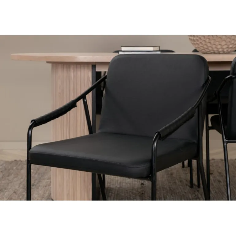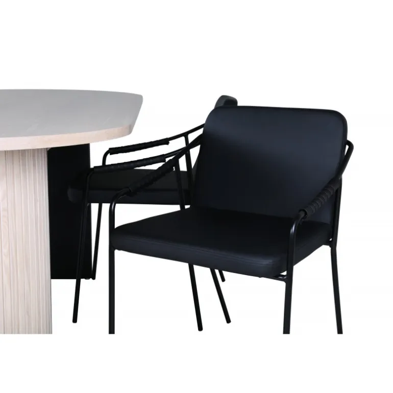 Skab et moderne blikfang i hjertet af hjemmet med Bianca Oval Spisebordssæt! Spisebordet Bianca er stilfuldt i pudset hvid farve og står tidens prøve. Bordet er ovalt og har et moderne design med en MDF-bordplade og et robust stel i ribbet design, der giver et stabilt indtryk. Sammen med 4 stole fra serien Tvist får du et komplet sæt. Stolene har sæde og ryg i sort polyurethan og polyester samt jernben. Det smarte og trendy design giver dig spisebordsstole, der forbedrer stemningen ved alle måltider og løfter din indretning til næste niveau!