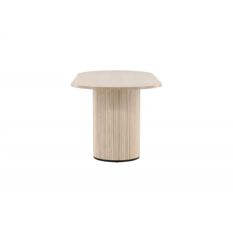 Bianca skaber et stilfuldt blikfang, der imponerer! Dette ovale spisebord i en pudset hvid farve har et moderne design med en MDF bordplade og en robust ramme i ribbet design, der giver et stabilt indtryk. Løft indretningen i stuen og inviter til mange hyggelige måltider fremover! Plejeanvisning: MDF-plader, der er malet eller lakeret, er følsomme over for ridser og skader. Vær derfor forsigtig med pladerne for at undgå dette. Overflader malet med lak med farvepigment eller maling har en pigmentering, der giver en ikke-dækkende gennemsigtig overflade.
