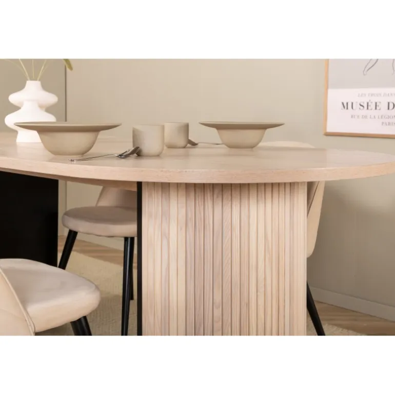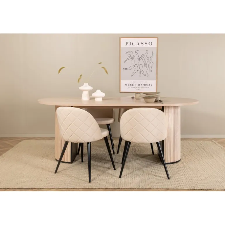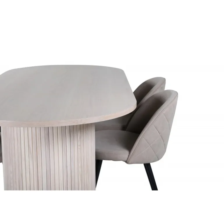 Oplev elegance og komfort med Bianca Ovalt spisebordssæt. Dette moderne Spisebordssæt fanger øjet med sit stilfulde design. Det ovale spisebord i en hvidvasket farve har en lækker overflade i MDF med finer og et robust stel i træ og MDF med ribbet design, der giver et stabilt udtryk. Bordets dimensioner er længde: 200 cm, bredde: 90 cm, højde: 75 cm. Sættet inkluderer også 4 af vores populære spisestole Velvet, som fokuserer på både stil og komfort. Stolene har en behagelig siddeflade i beige polyesterlinned og koniske ben i jern. Stolens dimensioner er højde: 76,5 cm, sædehøjde: 46,5 cm, bredde: 50 cm, dybde: 57 cm. Gør tiden ved spisebordet til dagens højdepunkt!