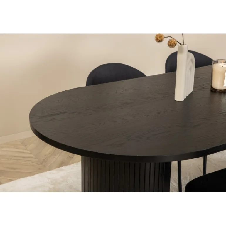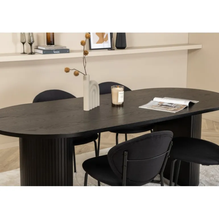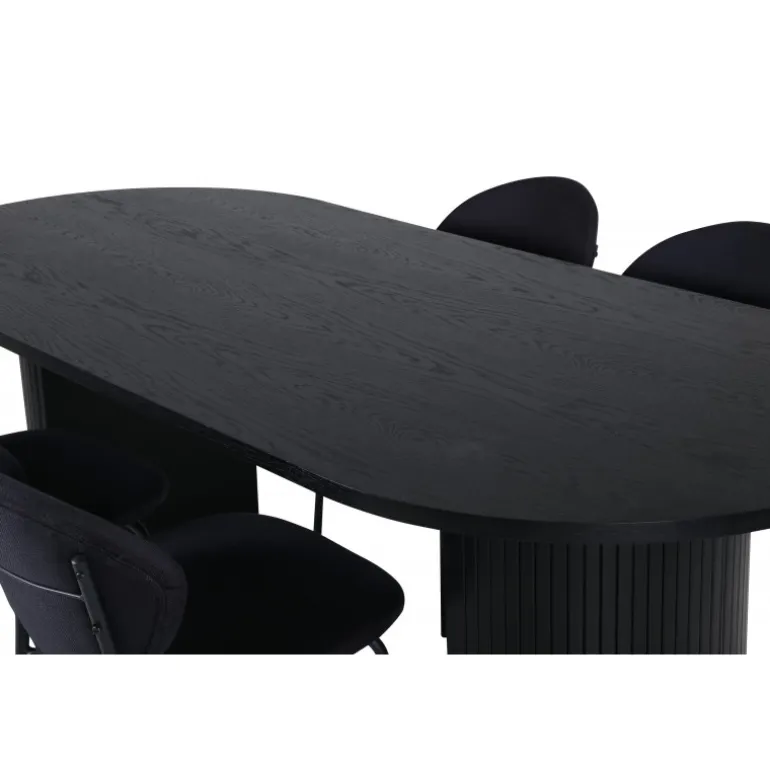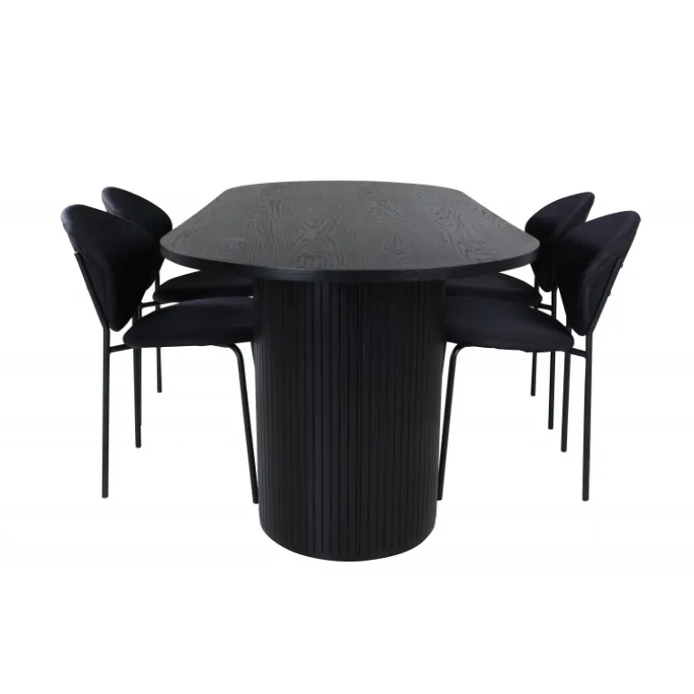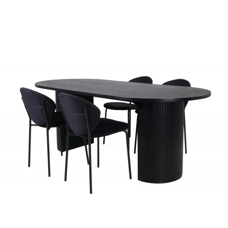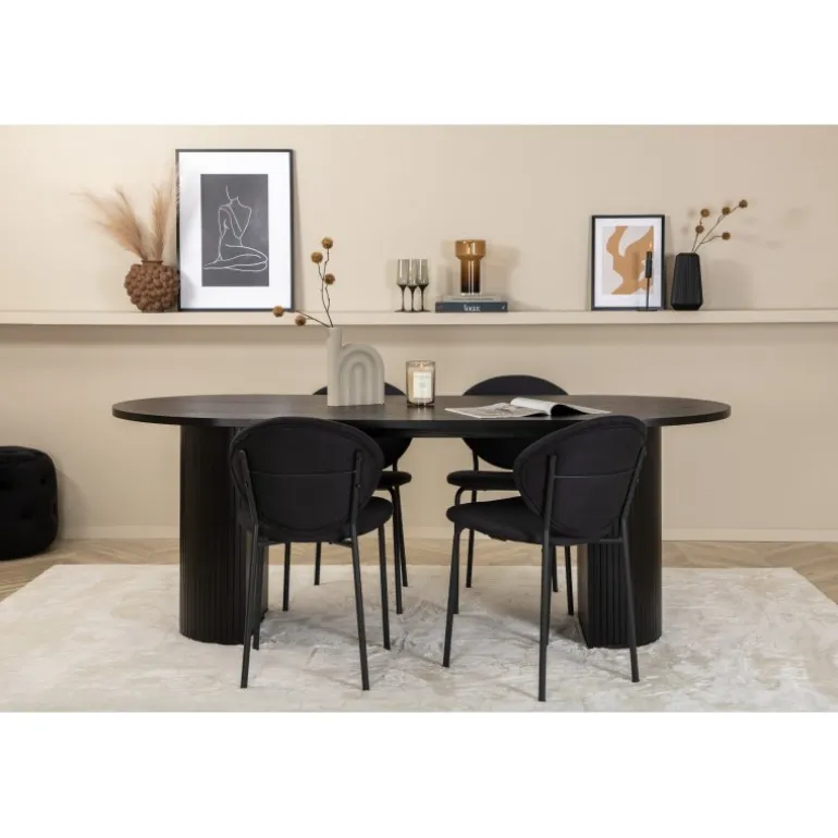 En fuldstændig sort madgruppe går aldrig af mode! Vores ovale spisestuebord Bianca i konsekvent sort farve har et trendy design med en MDF bordplade og en robust ramme i ribbet design, der giver et stabilt indtryk. Bordmål: Længde: 200 cm, Bredde: 90 cm, Højde: 75 cm. Matchet her med 4 Vault spisestuestole i ovalt design. Stolens ben er smalle i sort metal, og sædet er i sort polyester. Stolens mål: Højde: 80 cm, sædehøjde: 49 cm, bredde: 46 cm, dybde: 61,5 cm. Lad tiden ved spisebordet blive en af dagens højdepunkter!