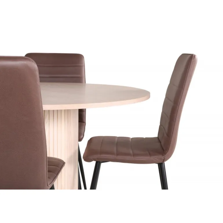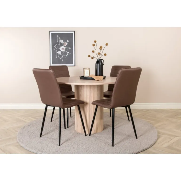Indret stuen moderne og hyggelig med et charmerende rundt spisebordssæt! Rundt om vores Bianca spisebord skaber du et fantastisk fællesskab, hvor ingen risikerer at sidde på kanten. Bordpladen er lavet af MDF og har en cylinderformet ramme i robust design og ribbet mønster. Den konsekvent malede hvide farve er både tidløs og stilfuld, og er let at matche med anden indretning. Her i en lækker kombination med 4 spisestole fra Windu Luxury-serien. Sædet er i brun mikrofiber og stolebenene i sort jern. Skab en indbydende blikfang i hjemmets hjerte!