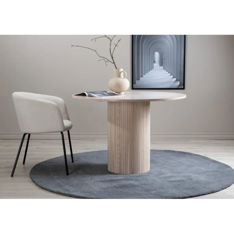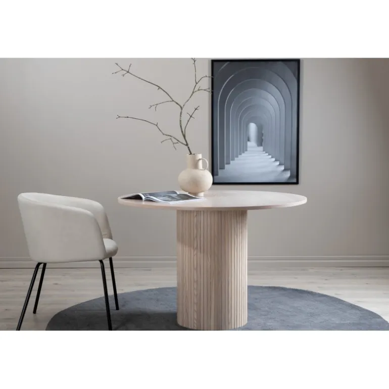 Skab et vidunderligt fællesskab omkring vores runde spisebord Bianca i et modebevidst design! Rundt spisebordpladen er lavet af MDF og har en cylinderformet ramme i robust design med ribbet struktur. Den konsekvent pudsede hvide farve er både tidløs og stilfuld, og let at matche med anden indretning. Forøg følelsen af dekoration og gør tiden til en af dagens højdepunkter! Plejeanvisning: MDF-plader, der er malet eller lakeret, er følsomme over for ridser og skader. Vær derfor forsigtig med pladerne for at undgå dette. Overflader malet med lak med farvepigment eller maling har en pigmentering, der giver en ikke-dækkende gennemsigtig overflade.