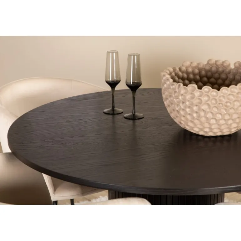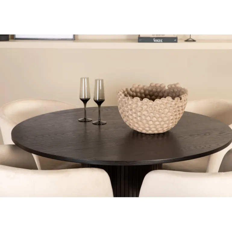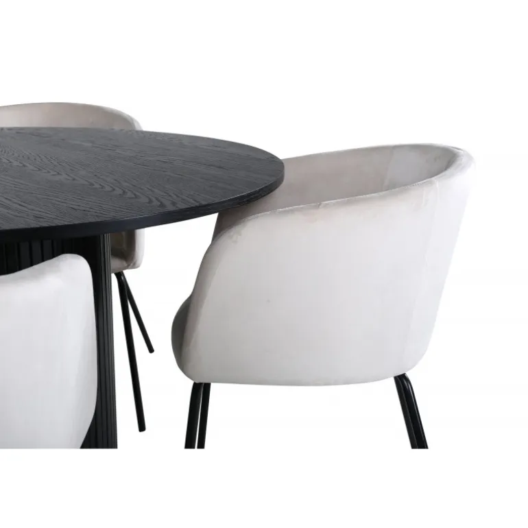 Moderne, stilfuldt og pompøst – skab et luksuriøst blikfang i hjemmets hjerte! Vores runde spisestuebord Bianca i gennemgående sort farve har et trendy design med en MDF bordplade og en robust ramme i ribbet design, der giver et solidt indtryk. Her i perfekt kombination med 4 Berit spisestuestole i luksuriøst design. Stolen har et pompøst design i beige fløjl og stolebenene er stilfuldt smalle i sort jern. Indret inviterende og skab et stilfuldt look i dit hjem!