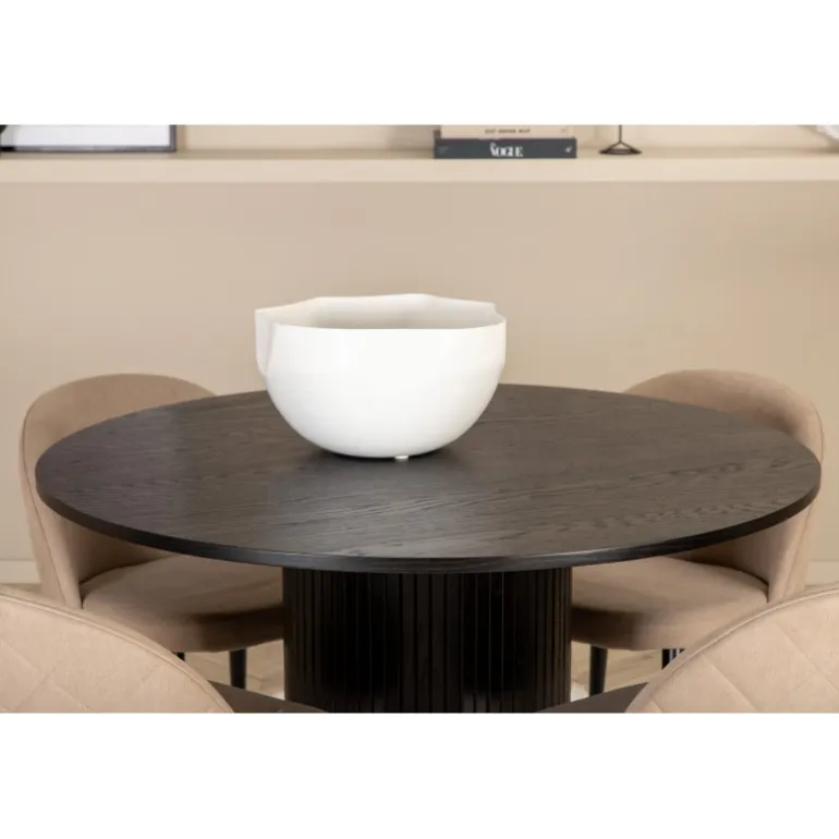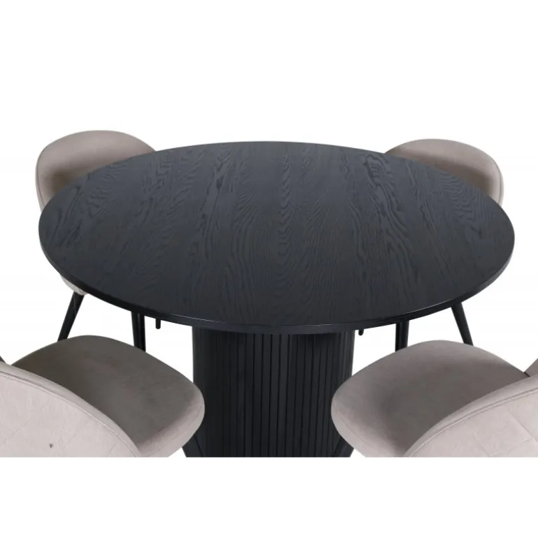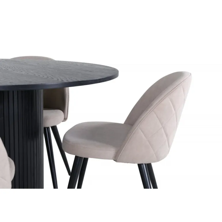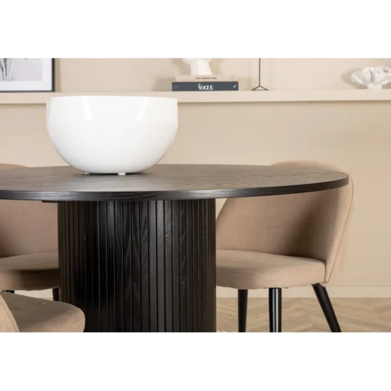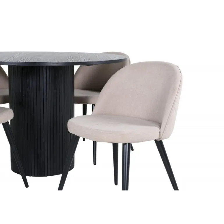 Skab en indbydende blikfanger i hjemmets hjerte! Vores runde spisebord Bianca i modig sort farve passer perfekt både i stuen eller det rummelige køkken. Bordpladen er sort i MDF med finer, og rammen er robust af træ og MDF i et ribbet design, der giver et stabilt indtryk. Her sammen med 4 af vores populære spisebordsstole Velvet Stitches, som bidrager til en dejlig helhed i stuen. Stolebenene er lette og skrå i sort jern, og de beige sæder er i polyesterlinned. Her får du en tidløs Spisebordssæt, der holder over tid!